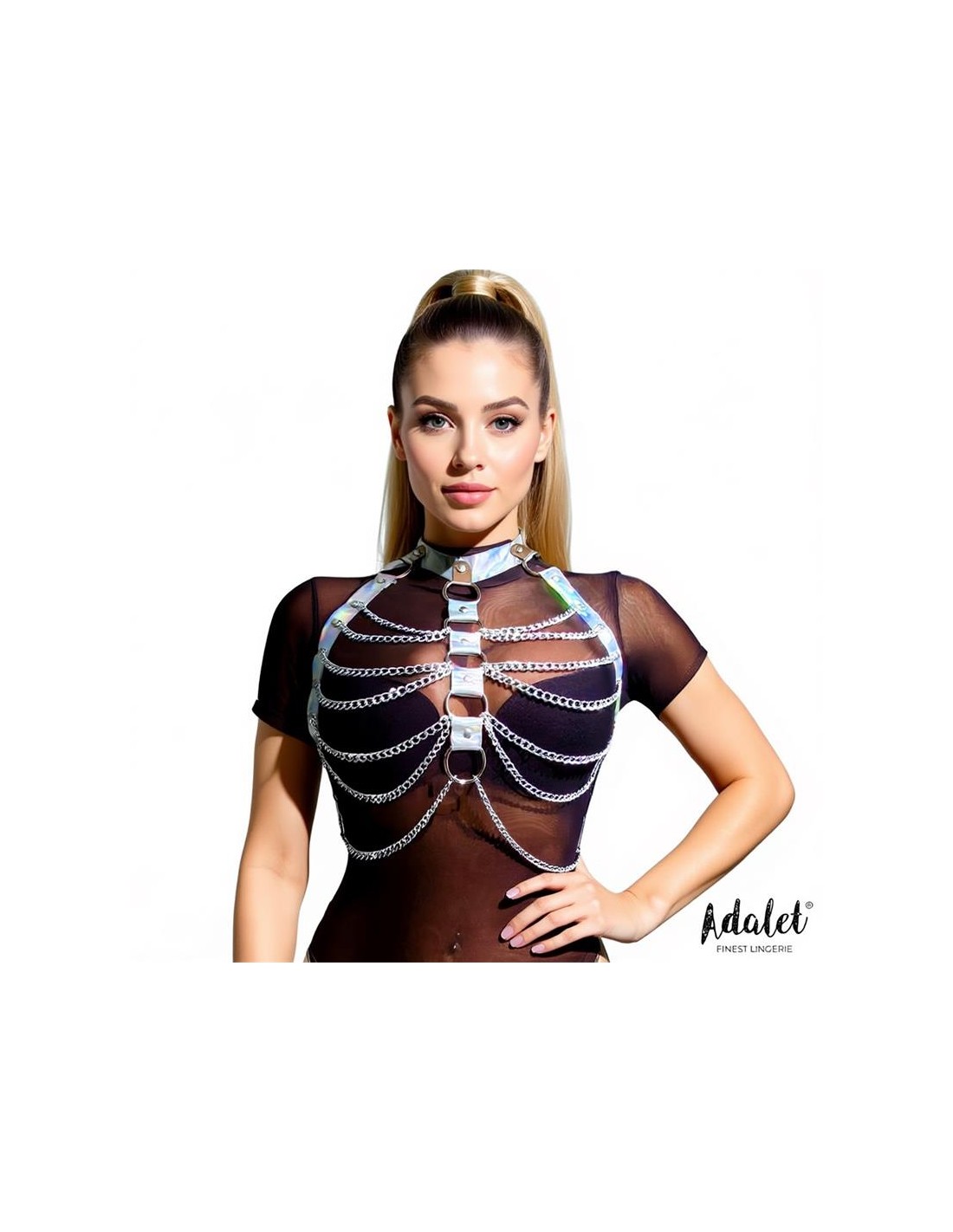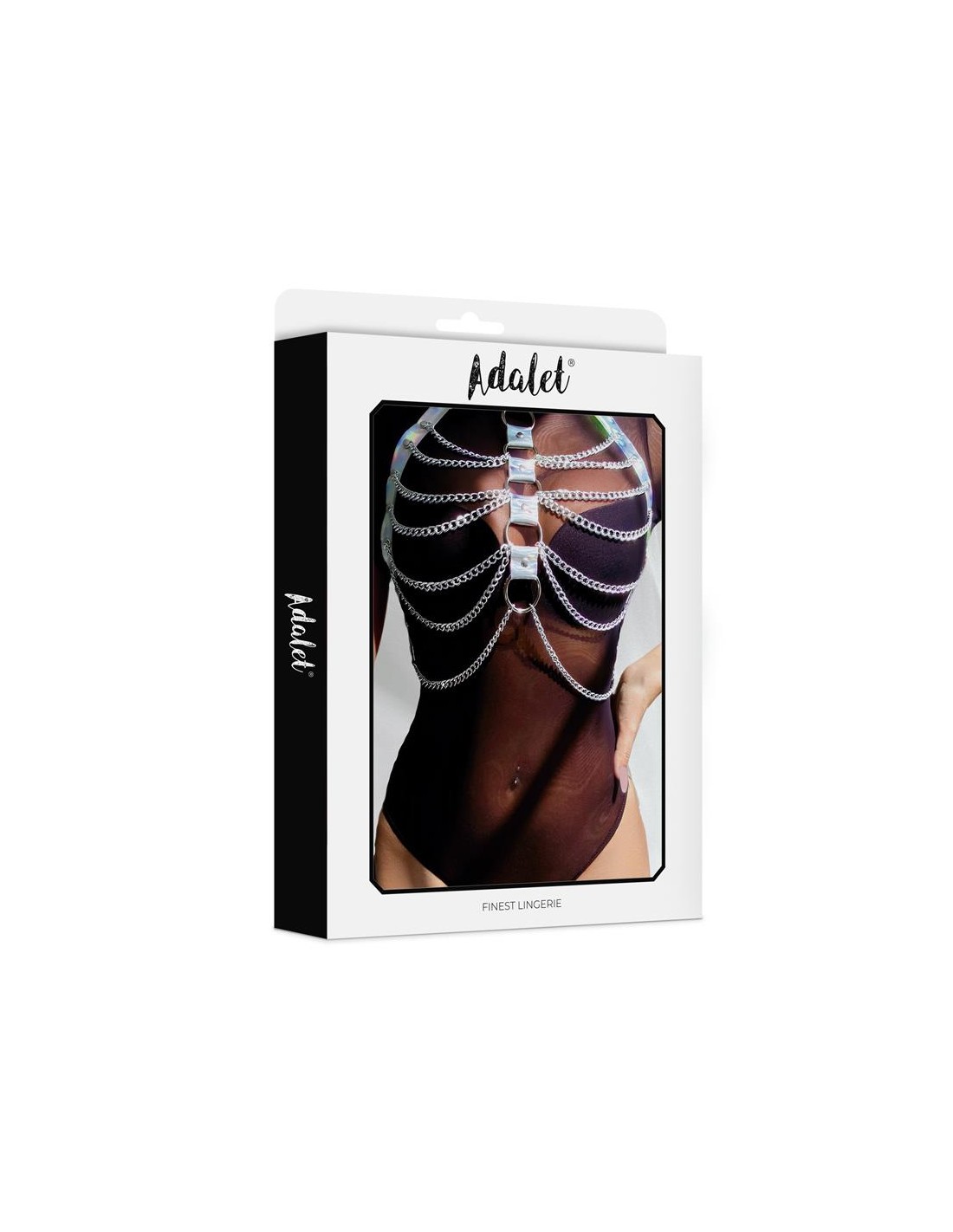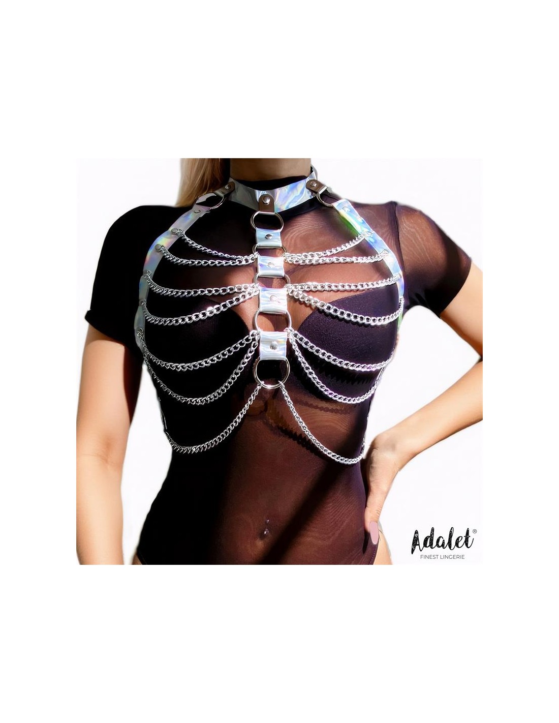 Si no sabes que ponerte para dejar a tu pareja con la boca abierta, este arnés para pecho es la elección perfecta. Cuenta con materiales en cuero vegano en color plata y con un diseño muy cañero que combina el cuero vegano con cadenas finas.