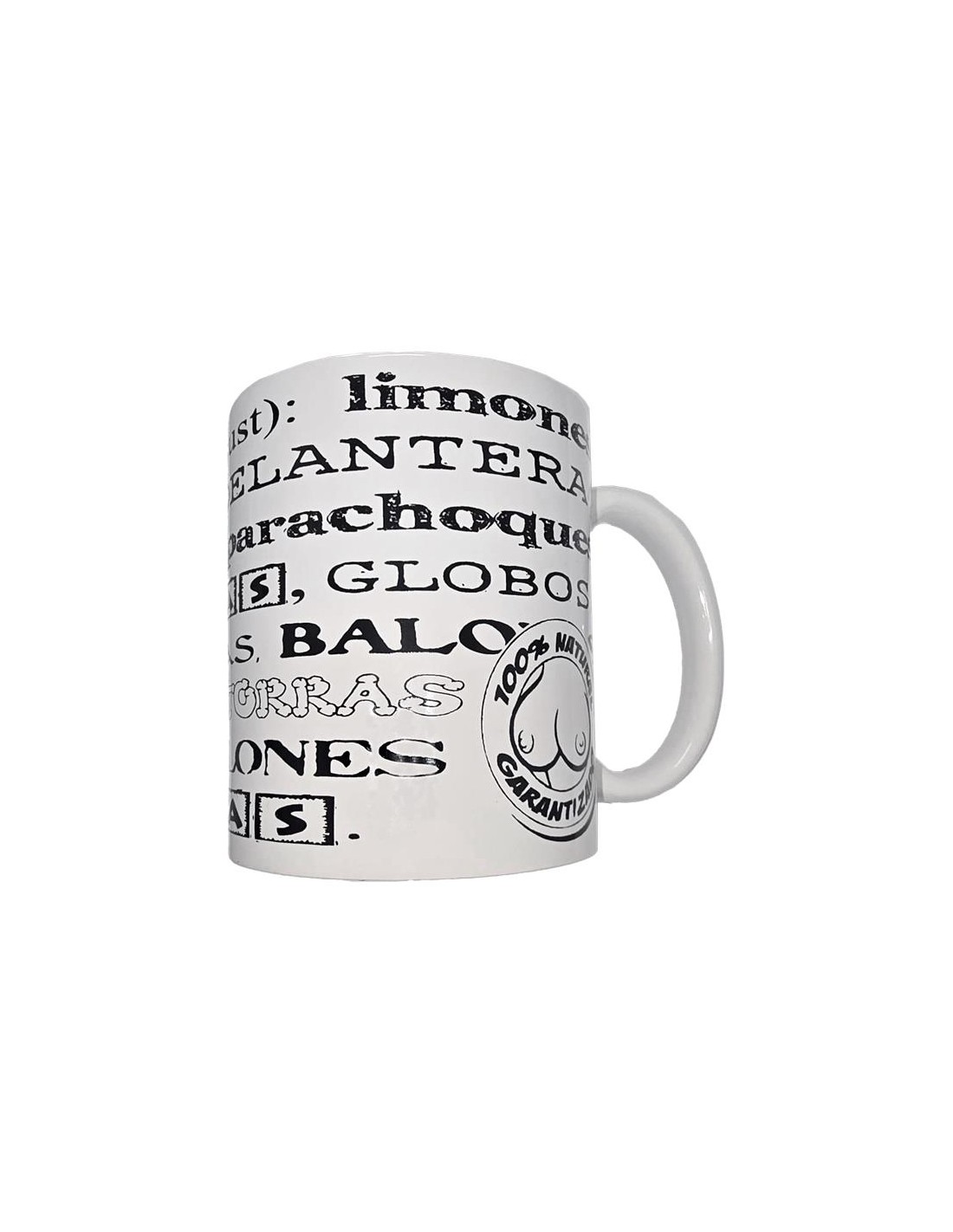 Taza de cerámica de 370 ml de color blanco con divertidos sinónimos de la palabra pechos una asa. Cada taza viene presentada en caja individual kraft.