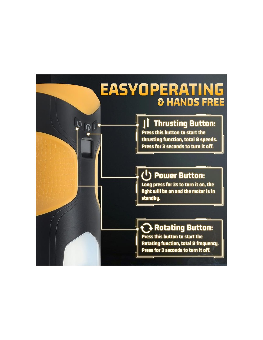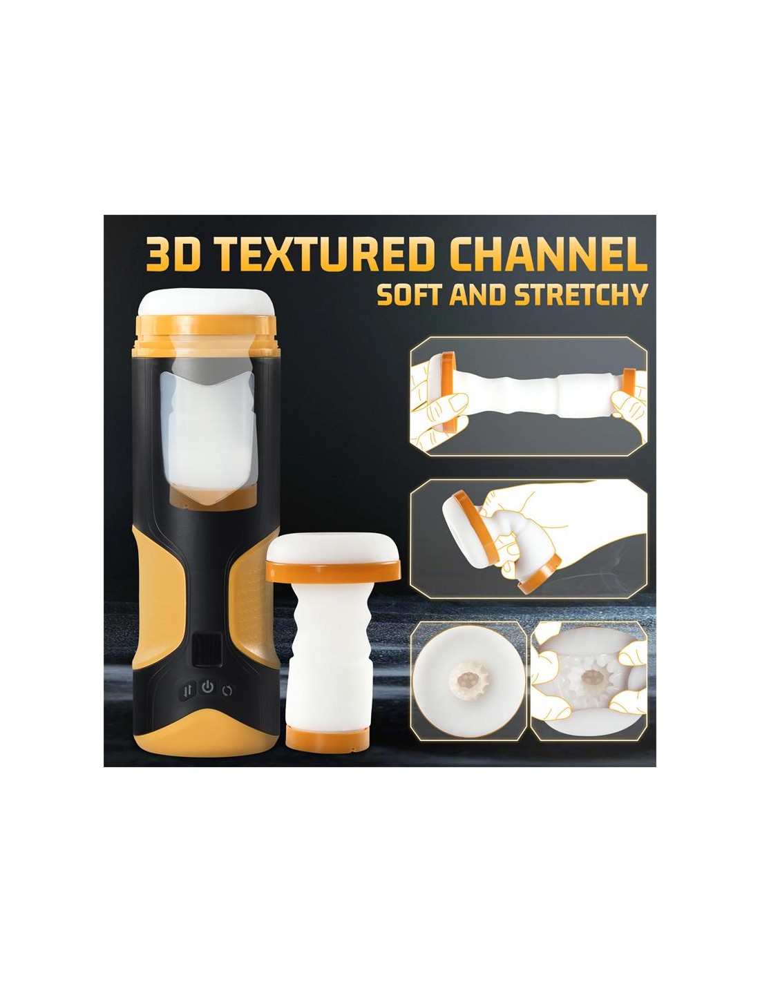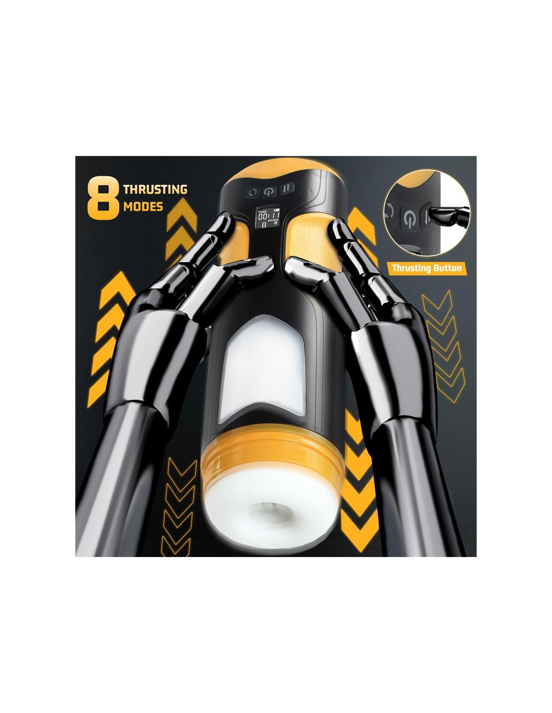 Masturbador masculino con un diseño moderno y futurista, con 8 velocidades de movimiento thrusting y 8 frecuencias de rotación. Cuenta con un canal totalmente texturizado y una manga suave y flexible. Podrás colocarlo casi en cualquier superficie gracias a su ventosa desmontable y posicionable.