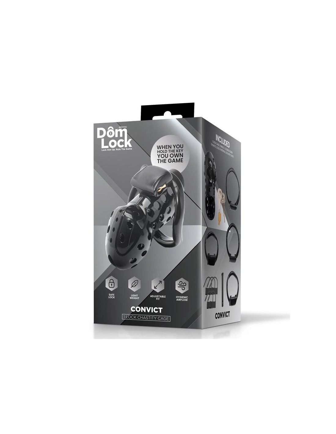 Convict es una jaula en color negro que incluye 4 anillos de diferentes tamaños para que puedas elegir el momento de usarlos y puedas disfrutar de la sumisión de la manera más segura posible. Al mismo tiempo incluye 1 pieza de bloqueo y 5 candados de plástico de un solo uso.