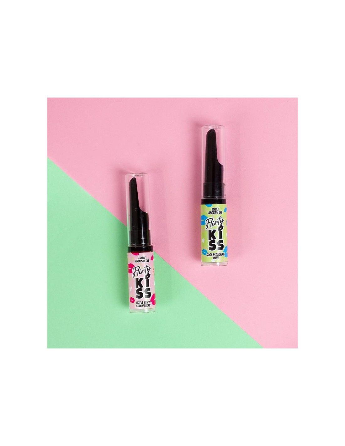 Flirty Kiss está compuesto por 2 geles, 1 gel de fresa con efecto calor picante y 1 gel de menta con frío vibrante.
