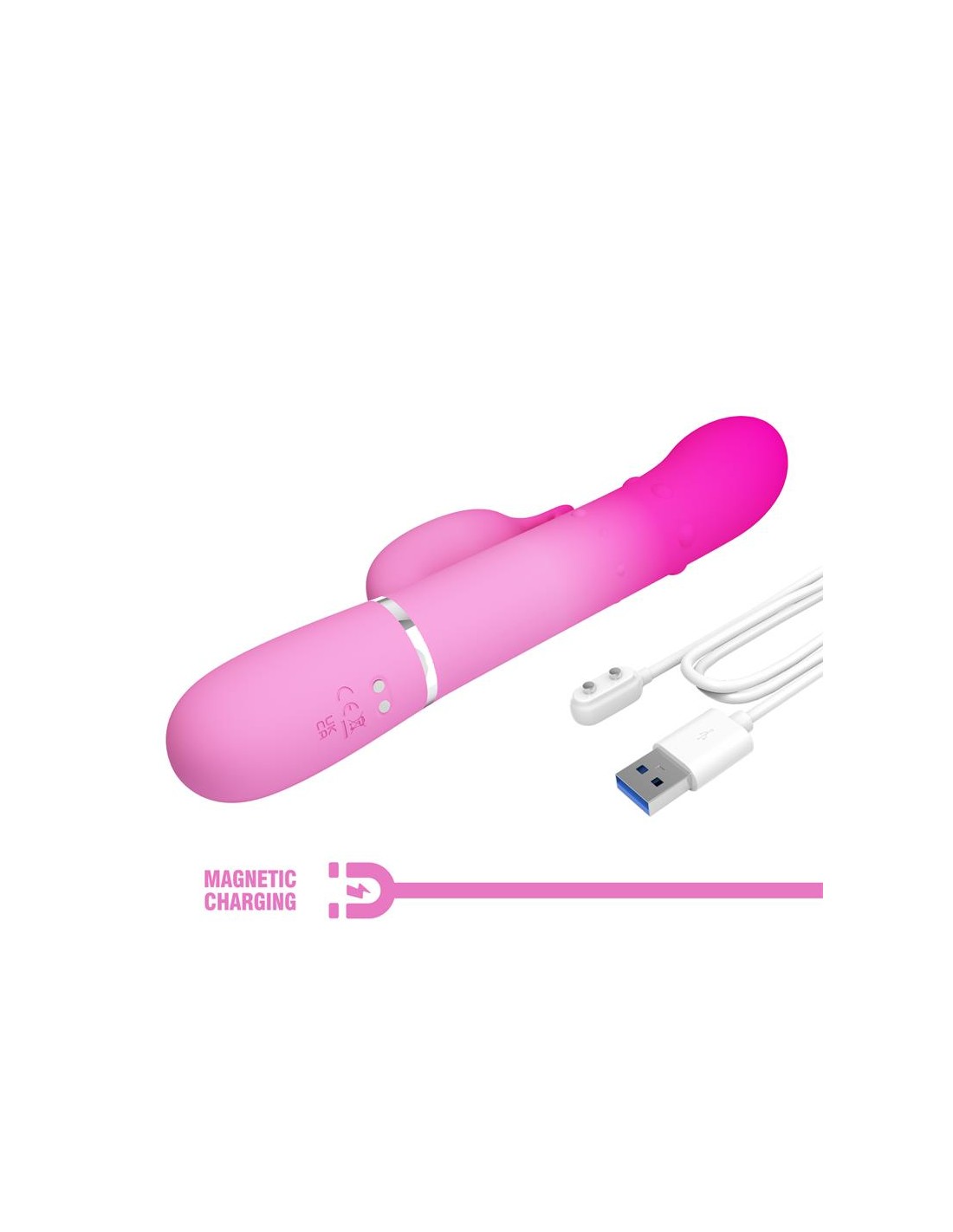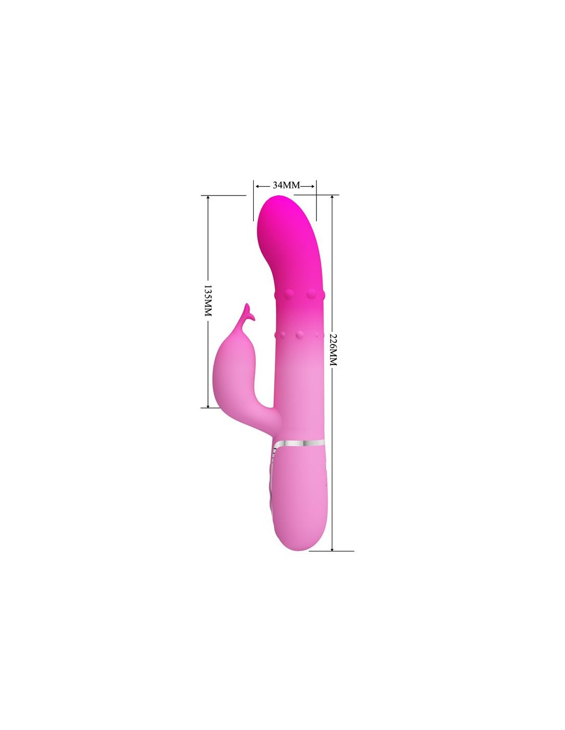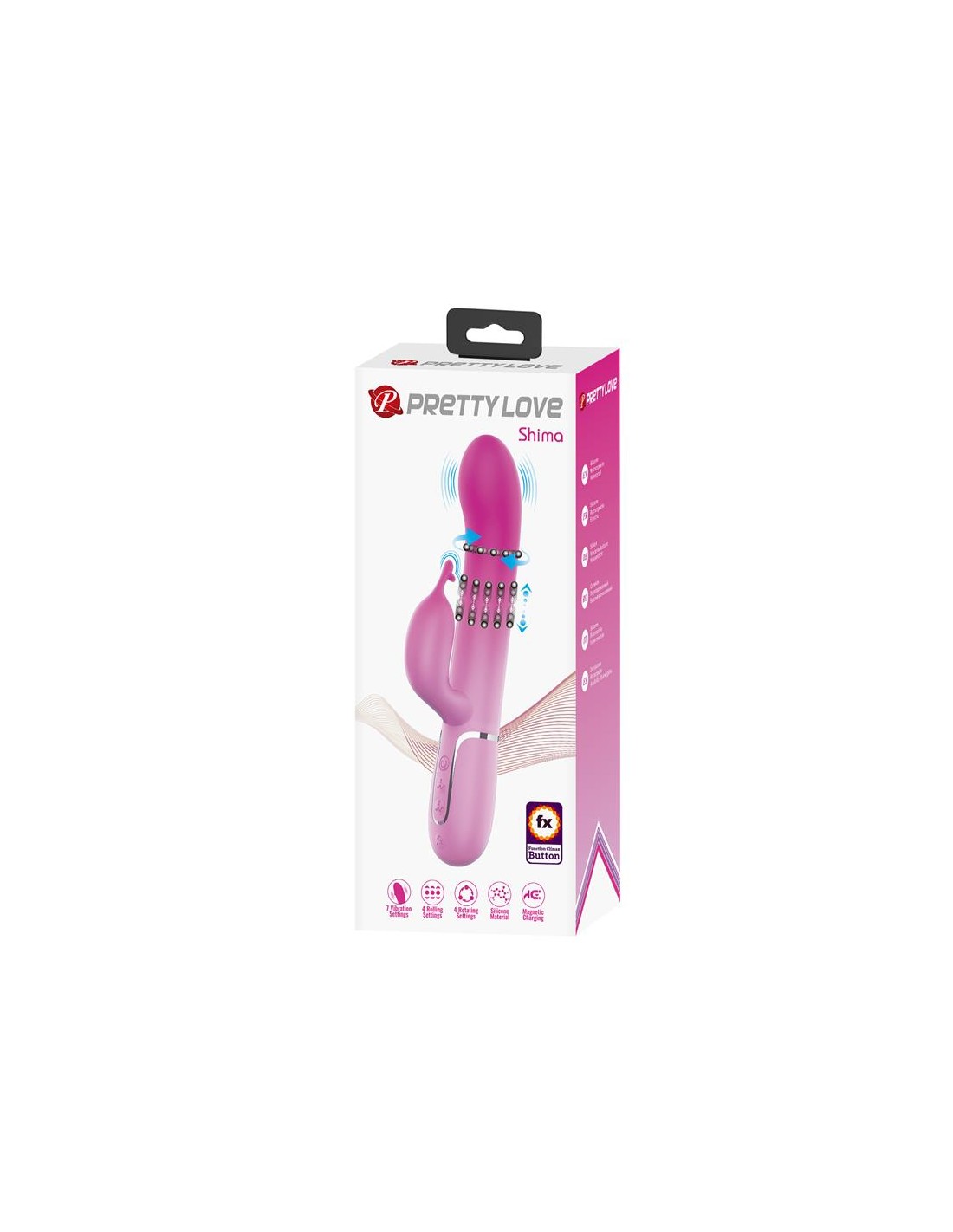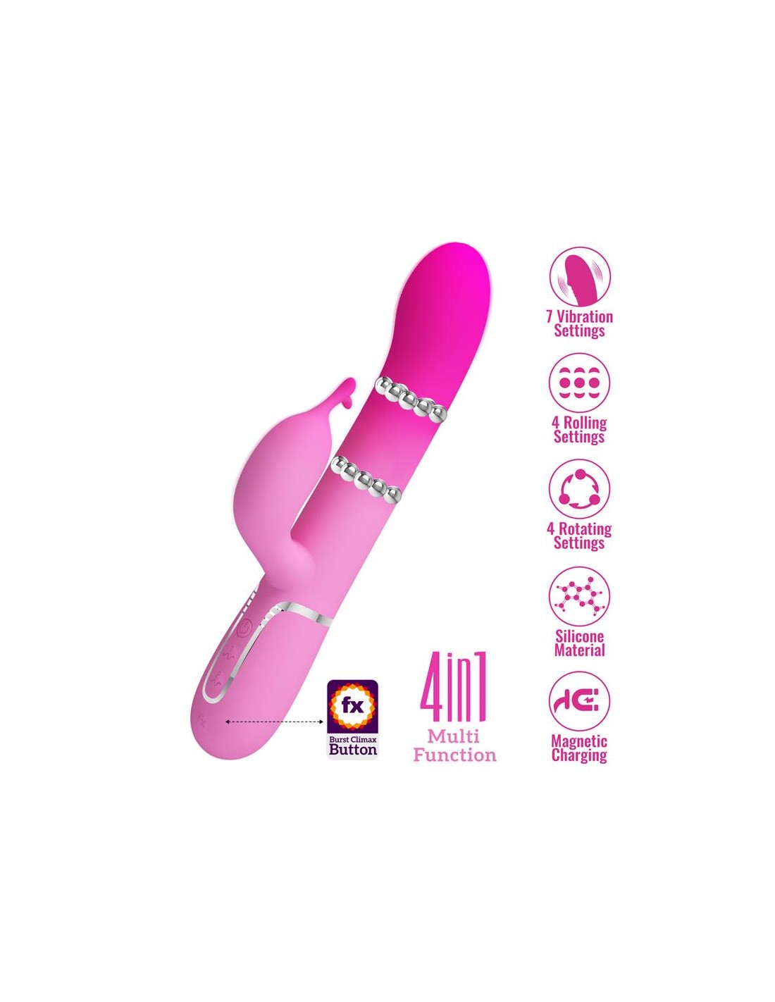 Diseñado para el máximo placer, el vibrador Pretty Love Rabbit cuenta con dos potentes motores, uno en la punta y otro en el brazo externo, te prometemos que encontrarás tu vibración perfecta, ya que sus 7 intensidades y ritmos de vibración te llevarán a un clímax intenso y envolvente. Cuenta con bolitas rígidas que se desplazan hacia arriba y hacia abajo en un estimulante masaje íntimo en la parte superior del eje, y disfruta simultáneamente de los 4 ajustes de velocidad de rotación de las bolitas en la parte inferior. Además, el estimulador de clítoris roza suavemente tu punto G. Para un placer aún mayor.