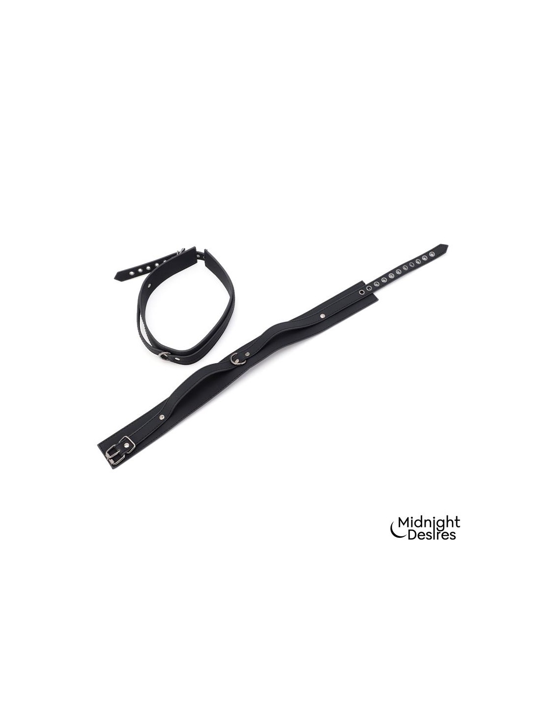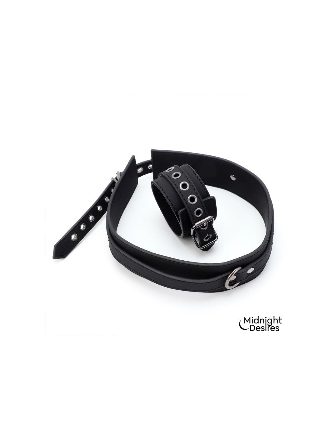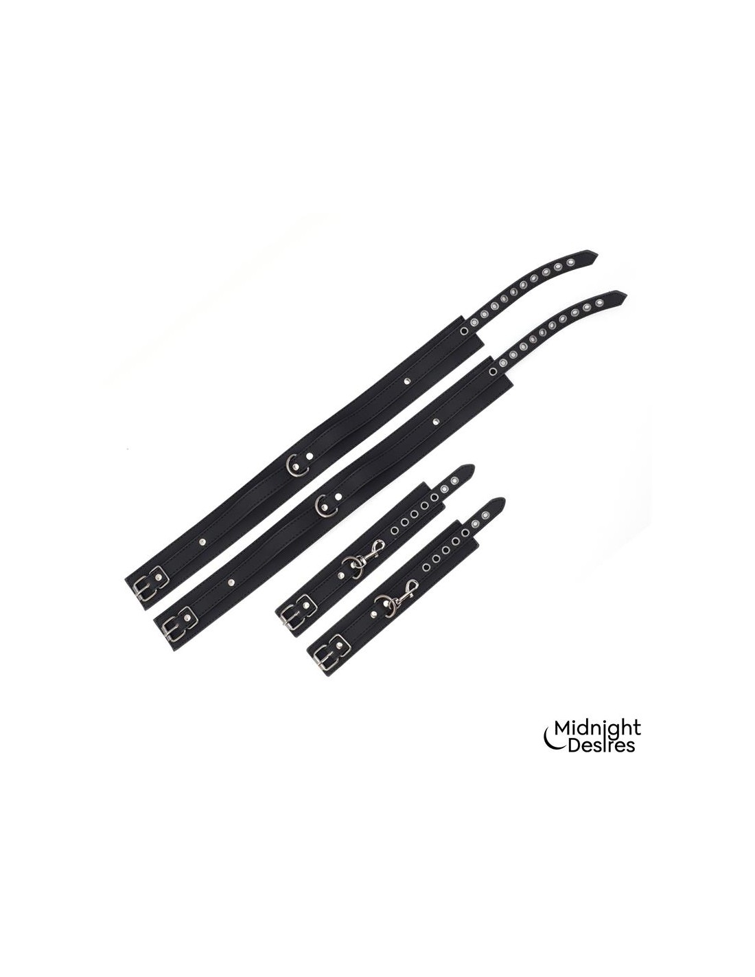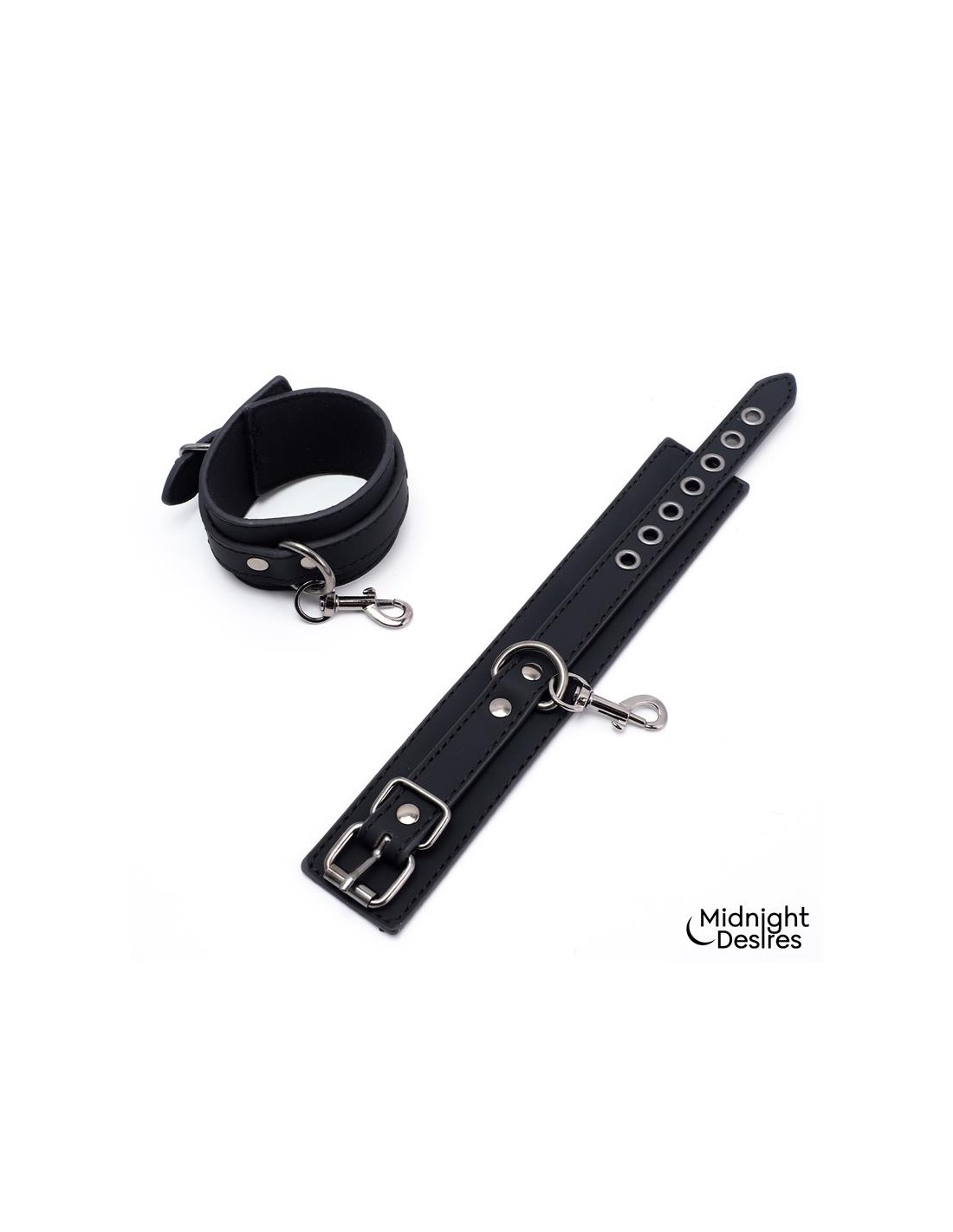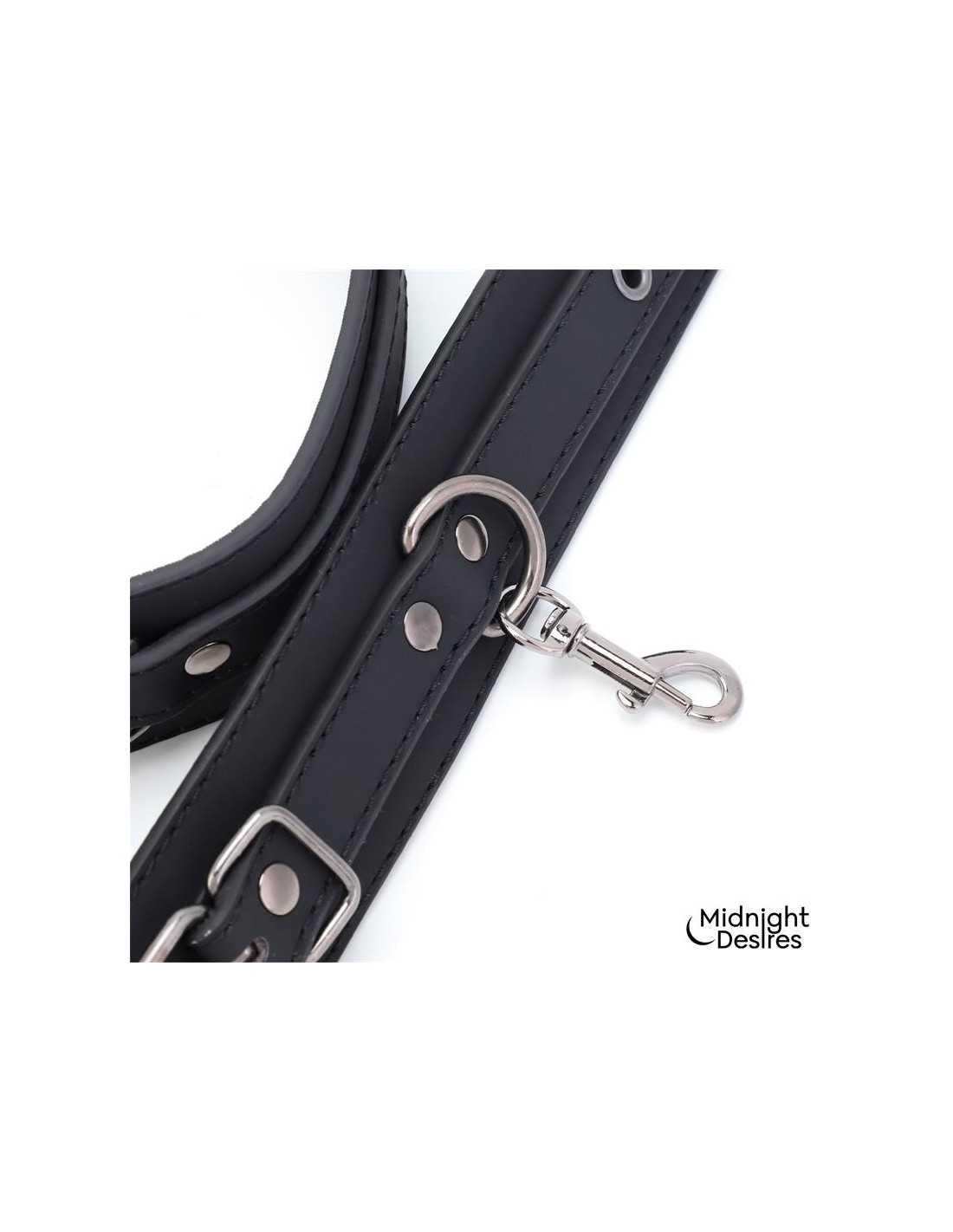 Mantén a tu sumisa donde la desees en cada momento con estas restricciones para muslos con esposas para muñecas. Cuenta con dos restricciones para los muslos, las cuales son totalmente ajustables con hebillas, igual que las esposas para muñecas.