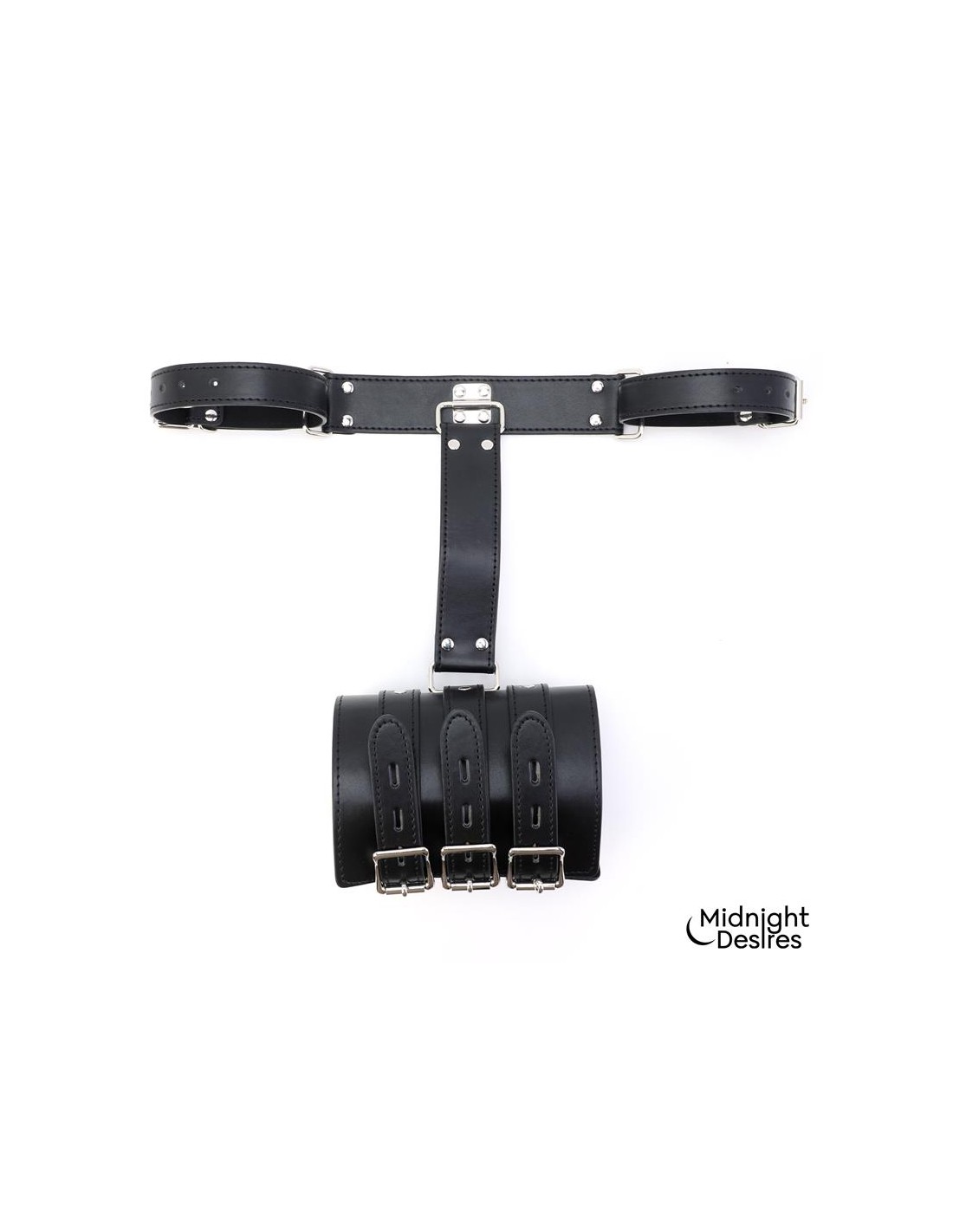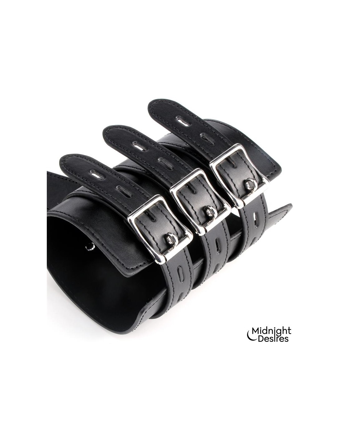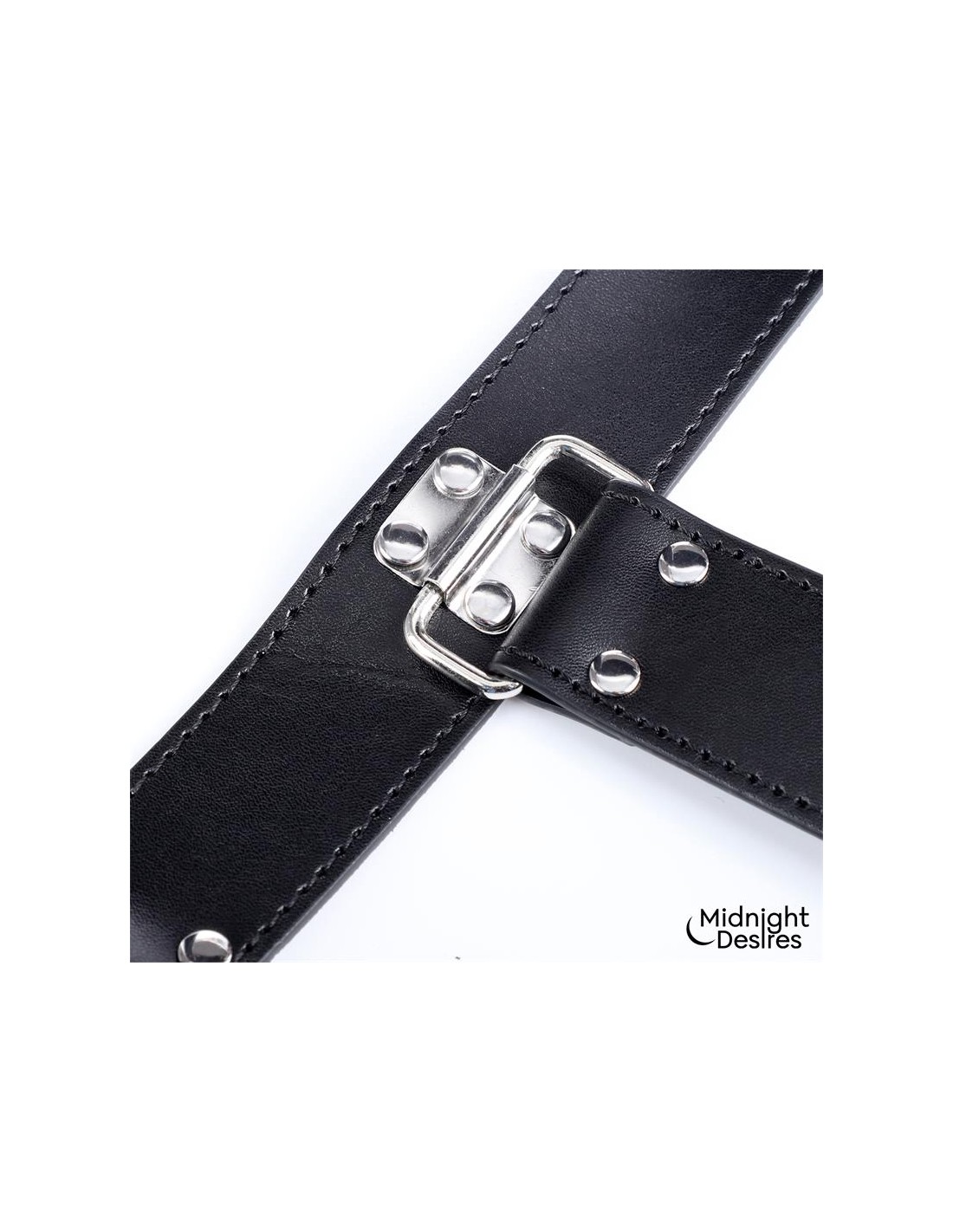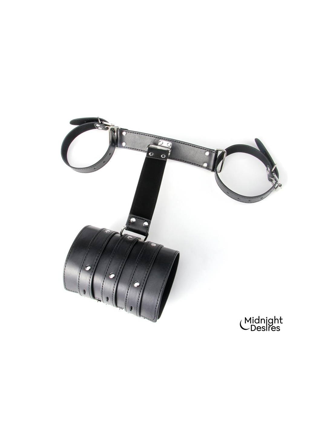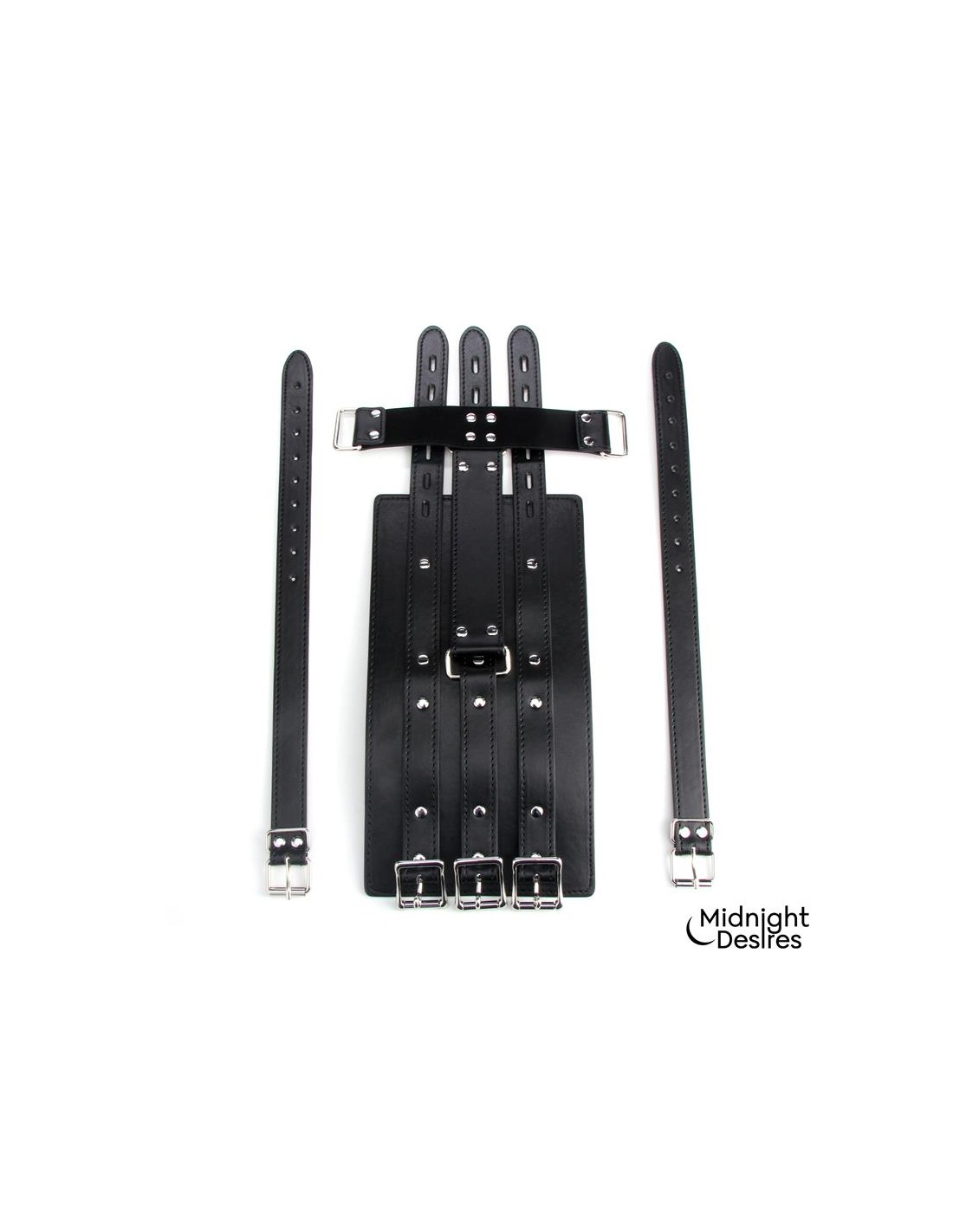 Tanto las esposas para los antebrazos como las esposas para los hombros son totalmente ajustables con hebillas. Todas las partes de este set son en cuero vegano, con detalles elegantes. Las hebillas y los remaches en color plata le dan un toque de lo más erótico.