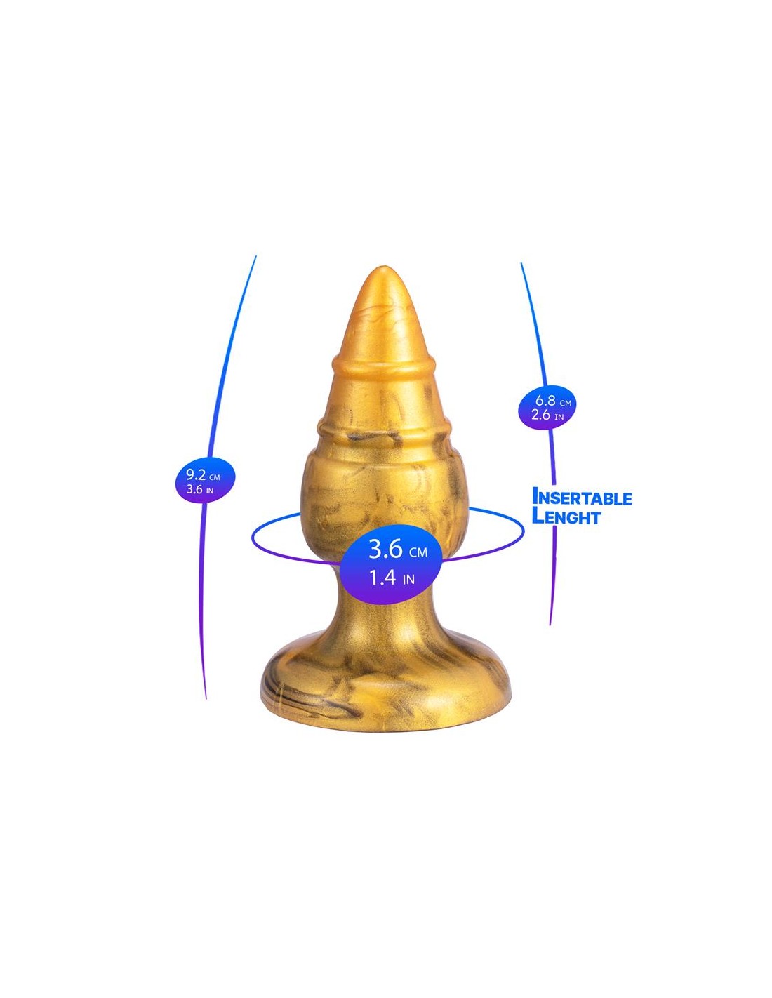 Con 92mm de longitud y 36mm de diámetro máximo, Goldy tiene el tamaño perfecto para disfrutar sin complicaciones. Sus 62g lo hacen ligero y manejable, mientras que su diseño escalonado con textura te ofrece sensaciones progresivas que van aumentando con cada nivel. Su acabado dorado le da un toque especial que lo convierte en una pieza única. Para principiantes o expertos, este plug marca la diferencia.
