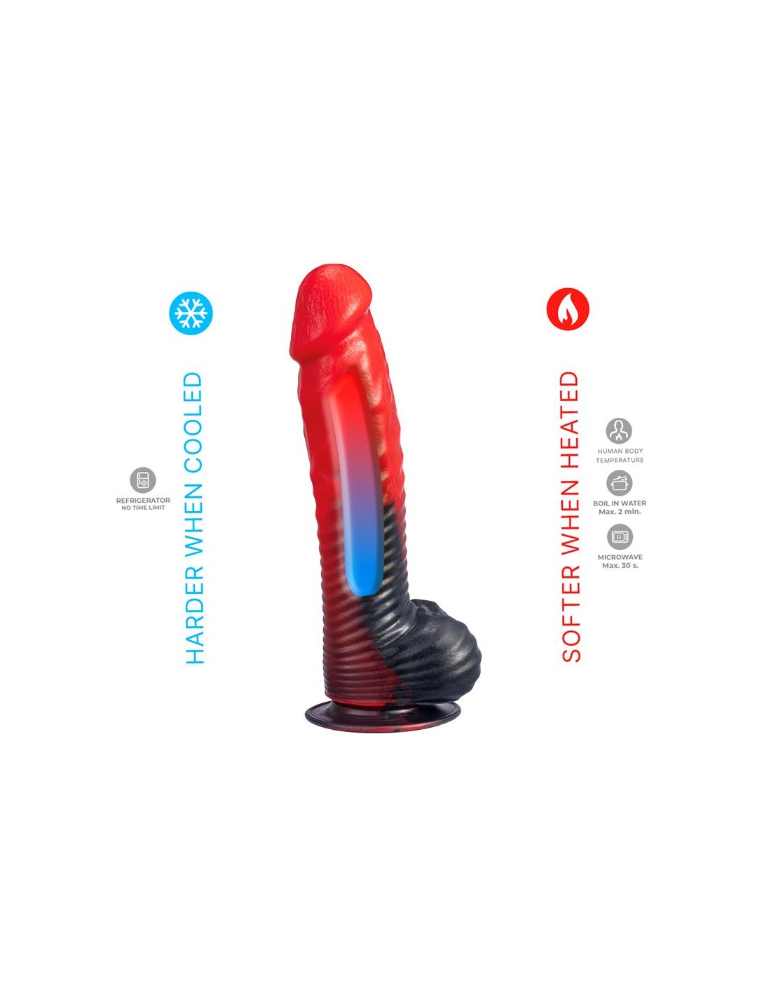 KEY POINTS: Dildo realista de 8 pulgadas con tecnología termoreactiva. Caliéntalo para suavidad o enfríalo para firmeza - tú mandas. Silicona líquida con núcleo de SILEXPAN. Longitud insertable de 15cm para placer profundo. Peso de 413g para sensación sólida e intensa. Textura realista con venas muy agradable al tacto. Parte superior realista y base con toque de fantasía para sensaciones únicas. Base con ventosa de 70mm para manos libres. Combinación impactante de negro y rojo. Perfecto para explorar tu lado más atrevido.