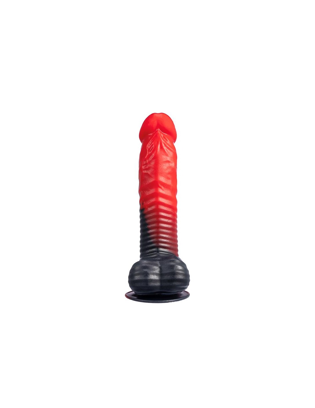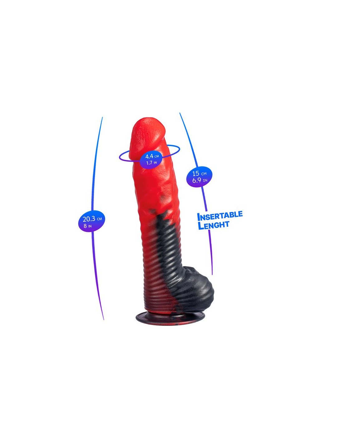 Con 203mm de longitud total y 15cm insertables, Devil tiene un tamaño generoso perfecto para explorar sin límites. Su diámetro máximo de 39,5mm te garantiza placer sin complicaciones. Sus 413g le dan un peso sólido y presencia imponente, haciendo que cada movimiento se sienta increíblemente real. Su textura realista con venas es muy agradable al tacto gracias a la silicona líquida, mientras que la parte inferior cuenta con un toque de fantasía que te hace notar sensaciones únicas. Su impactante combinación de negro y rojo refleja su personalidad. La base con ventosa de 70mm te da total libertad para jugar.