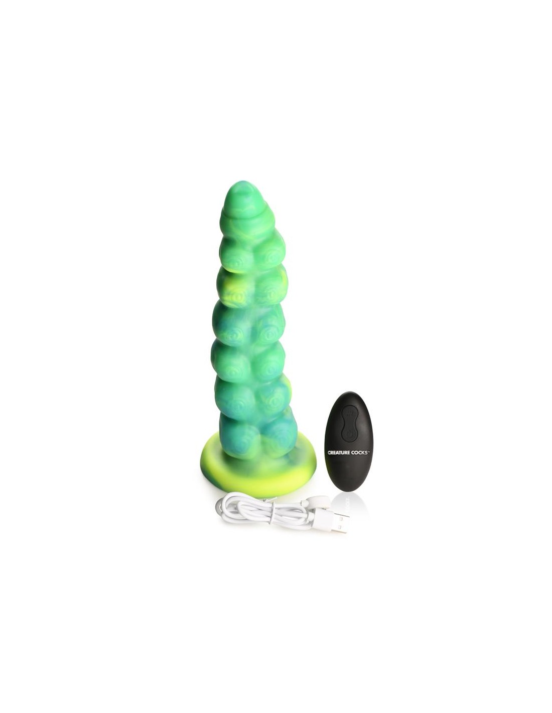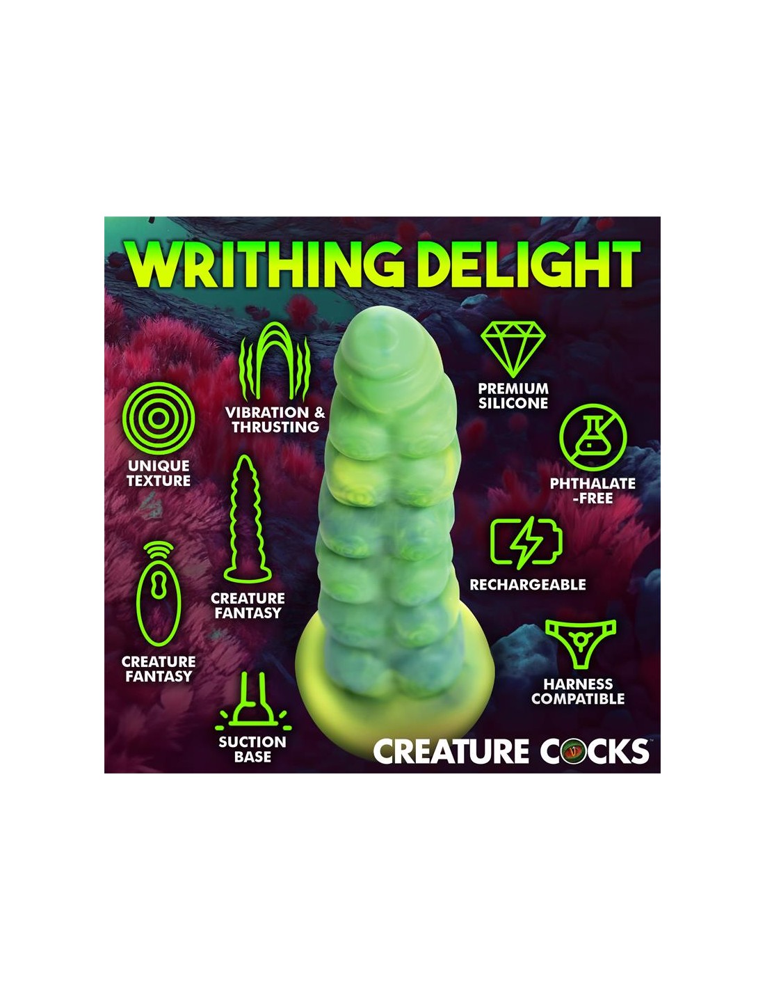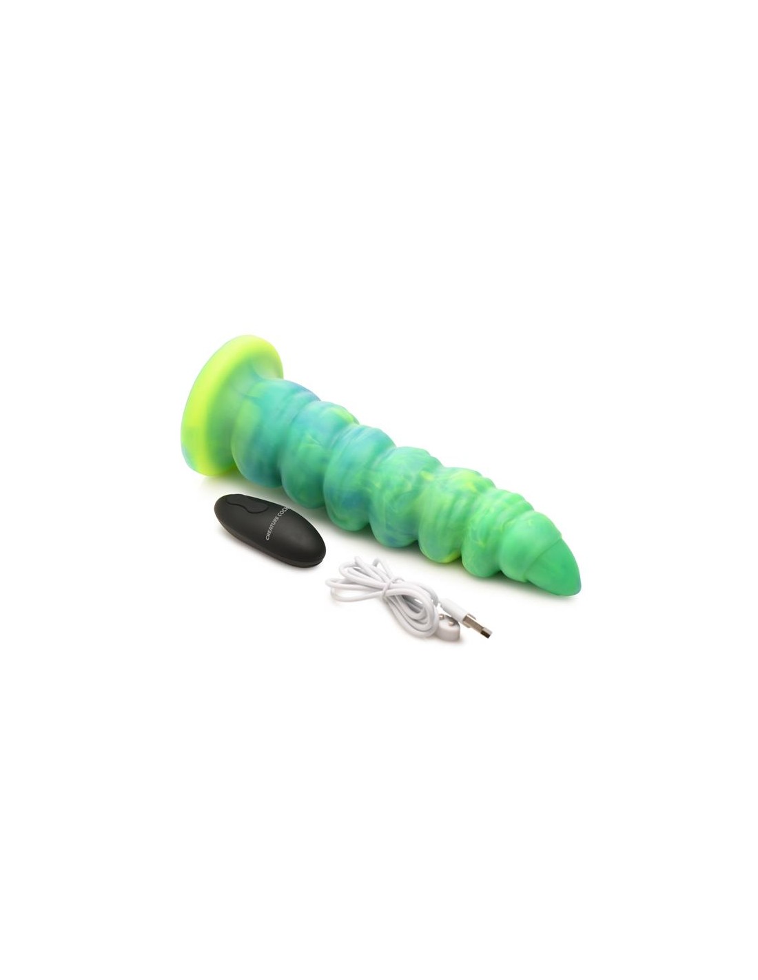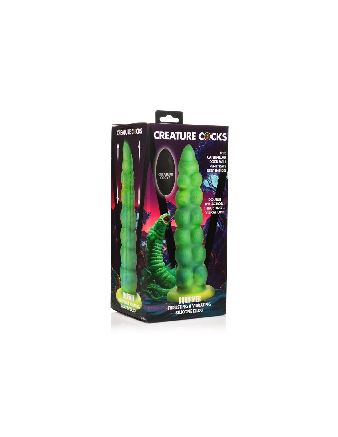 Arrastrándose y penetrando tu realidad? el dildo con vibración y movimiento thrusting Squirmer está listo para penetrar tus fantasías y satisfacer tus deseos más profundos. Hecho de silicona premium, es suave pero firme, con un material libre de ftalatos y seguro para el cuerpo en el que puedes confiar. El colorido eje verde amarillento está cubierto de protuberancias texturizadas que rozan cada parte de tu cuerpo mientras disfrutas de 5 patrones de penetración. ¡El excitante Creature Cock también vibra! ¡Disfruta de 3 velocidades y 7 patrones de vibración! Usa el control remoto a pilas para cambiar la configuración tú mismo o dáselo a tu pareja. ¡Disfruta de cualquier cosplay atrevido, fantasía descabellada o escena de terror y ciencia ficción que tú o tu pareja sueñen! Este dildo es compatible con arneses con correa y tiene una base de ventosa para disfrutar de experiencias en solitario con manos libres. Úsalo solo con lubricantes a base de agua para obtener mejores resultados. El dildo se recarga mediante el cable USB incluido.