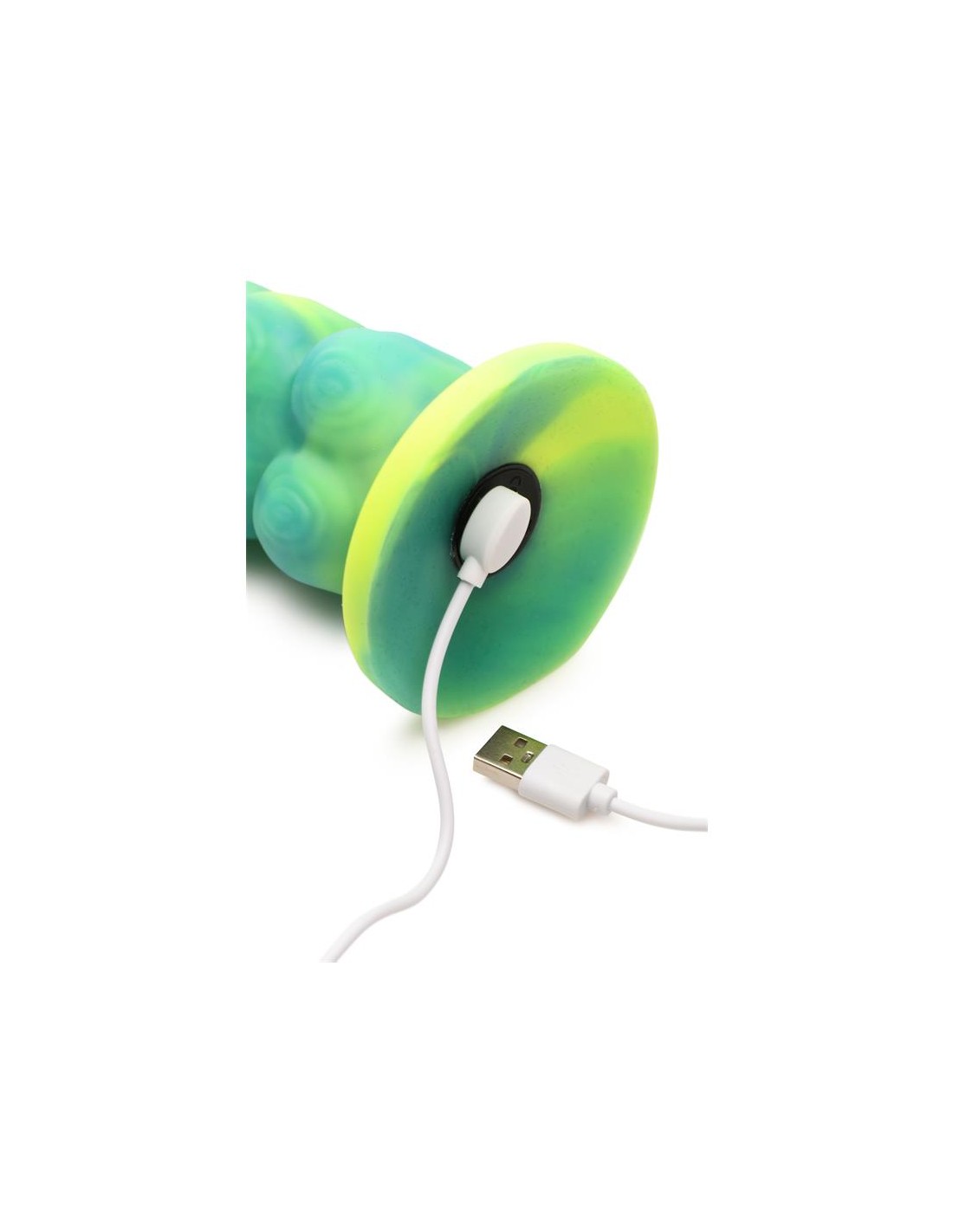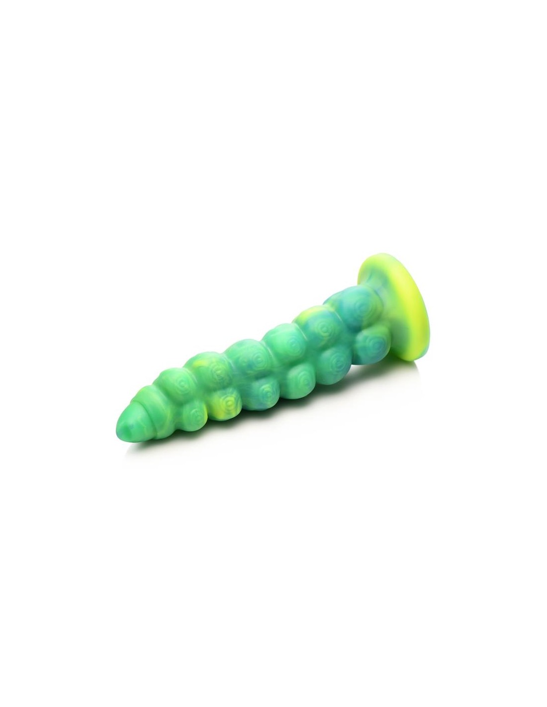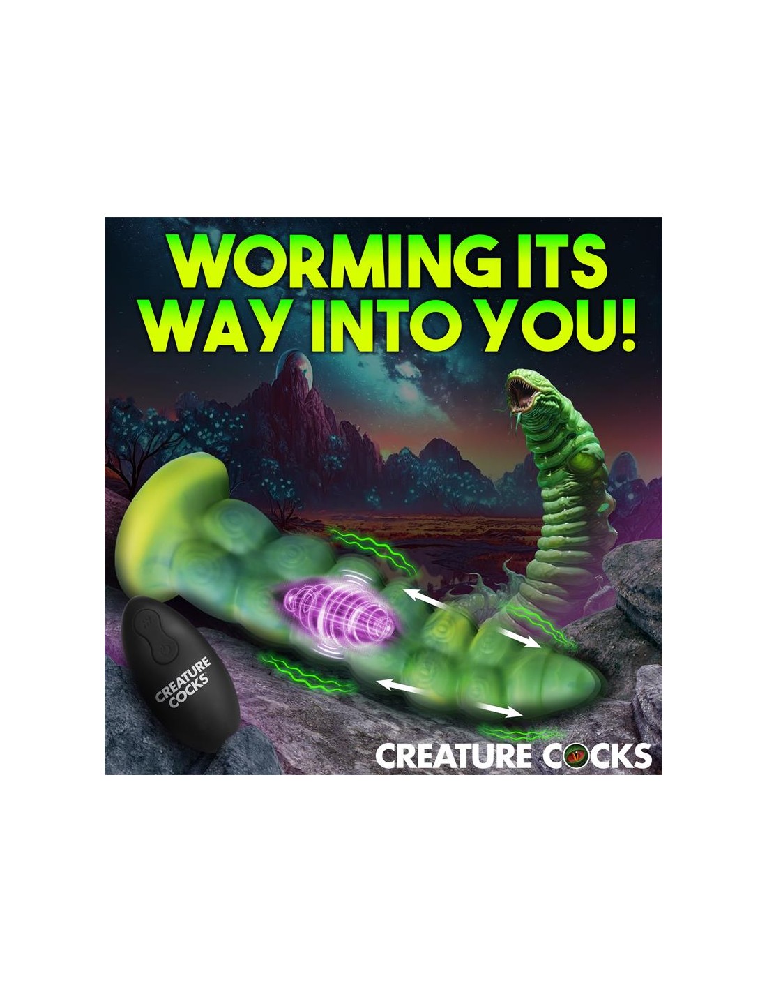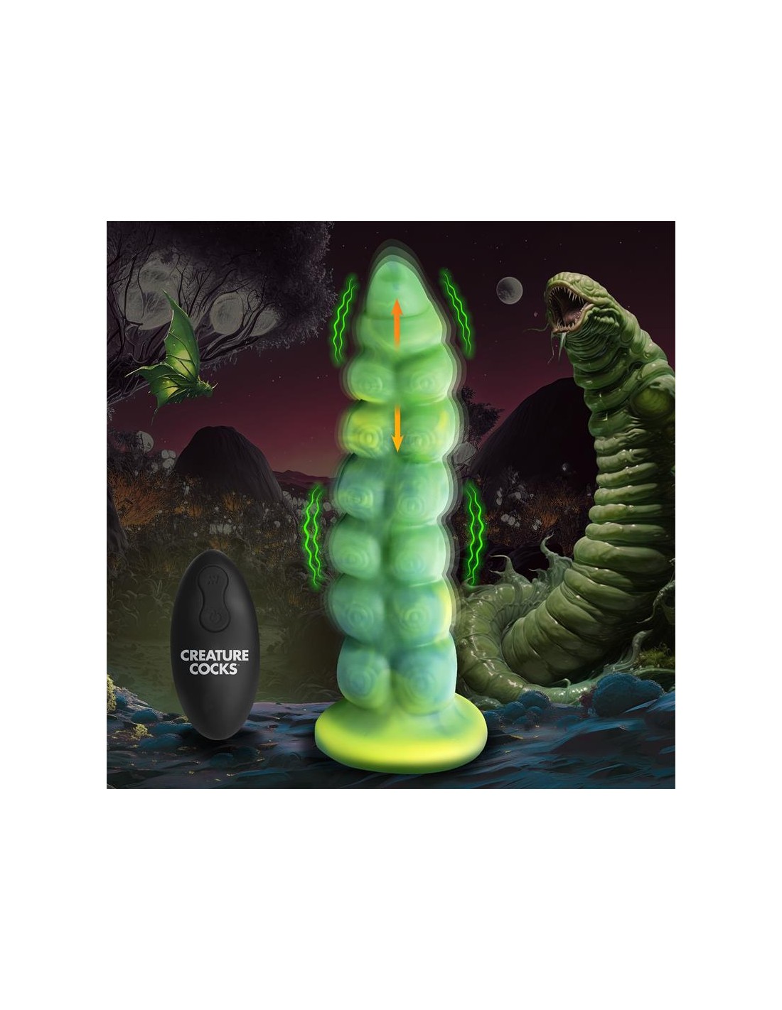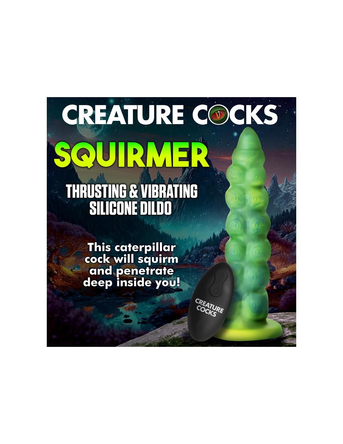 Arrastrándose y penetrando tu realidad? el dildo con vibración y movimiento thrusting Squirmer está listo para penetrar tus fantasías y satisfacer tus deseos más profundos. Hecho de silicona premium, es suave pero firme, con un material libre de ftalatos y seguro para el cuerpo en el que puedes confiar. El colorido eje verde amarillento está cubierto de protuberancias texturizadas que rozan cada parte de tu cuerpo mientras disfrutas de 5 patrones de penetración. ¡El excitante Creature Cock también vibra! ¡Disfruta de 3 velocidades y 7 patrones de vibración! Usa el control remoto a pilas para cambiar la configuración tú mismo o dáselo a tu pareja. ¡Disfruta de cualquier cosplay atrevido, fantasía descabellada o escena de terror y ciencia ficción que tú o tu pareja sueñen! Este dildo es compatible con arneses con correa y tiene una base de ventosa para disfrutar de experiencias en solitario con manos libres. Úsalo solo con lubricantes a base de agua para obtener mejores resultados. El dildo se recarga mediante el cable USB incluido.