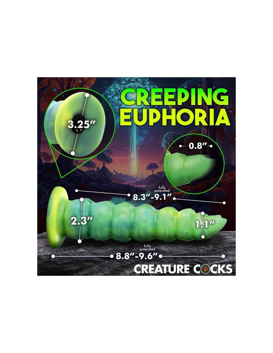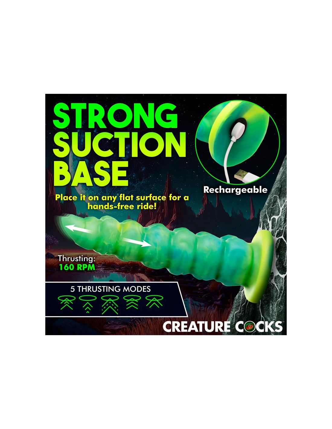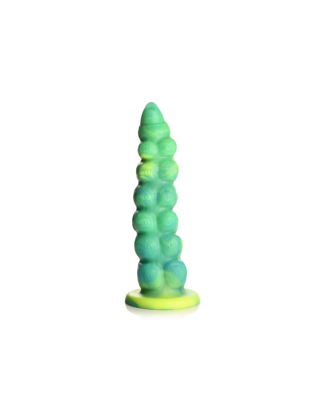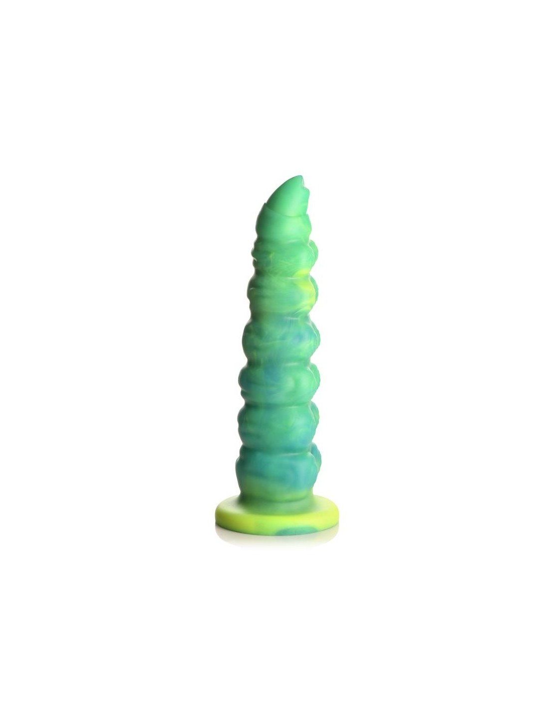 Arrastrándose y penetrando tu realidad? el dildo con vibración y movimiento thrusting Squirmer está listo para penetrar tus fantasías y satisfacer tus deseos más profundos. Hecho de silicona premium, es suave pero firme, con un material libre de ftalatos y seguro para el cuerpo en el que puedes confiar. El colorido eje verde amarillento está cubierto de protuberancias texturizadas que rozan cada parte de tu cuerpo mientras disfrutas de 5 patrones de penetración. ¡El excitante Creature Cock también vibra! ¡Disfruta de 3 velocidades y 7 patrones de vibración! Usa el control remoto a pilas para cambiar la configuración tú mismo o dáselo a tu pareja. ¡Disfruta de cualquier cosplay atrevido, fantasía descabellada o escena de terror y ciencia ficción que tú o tu pareja sueñen! Este dildo es compatible con arneses con correa y tiene una base de ventosa para disfrutar de experiencias en solitario con manos libres. Úsalo solo con lubricantes a base de agua para obtener mejores resultados. El dildo se recarga mediante el cable USB incluido.