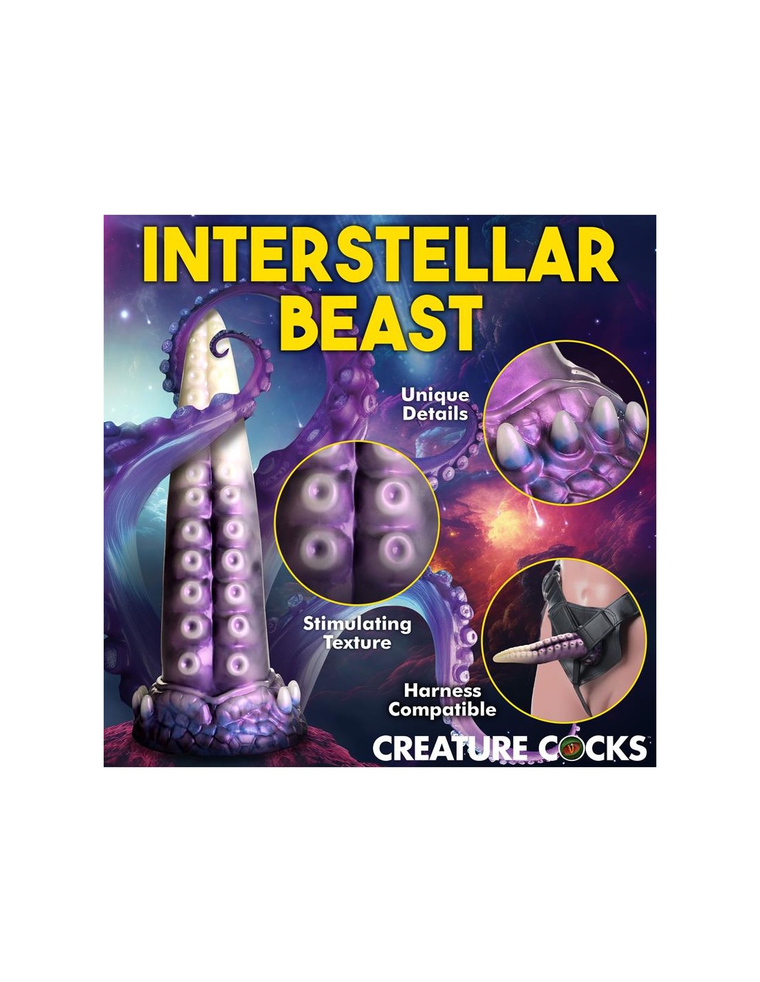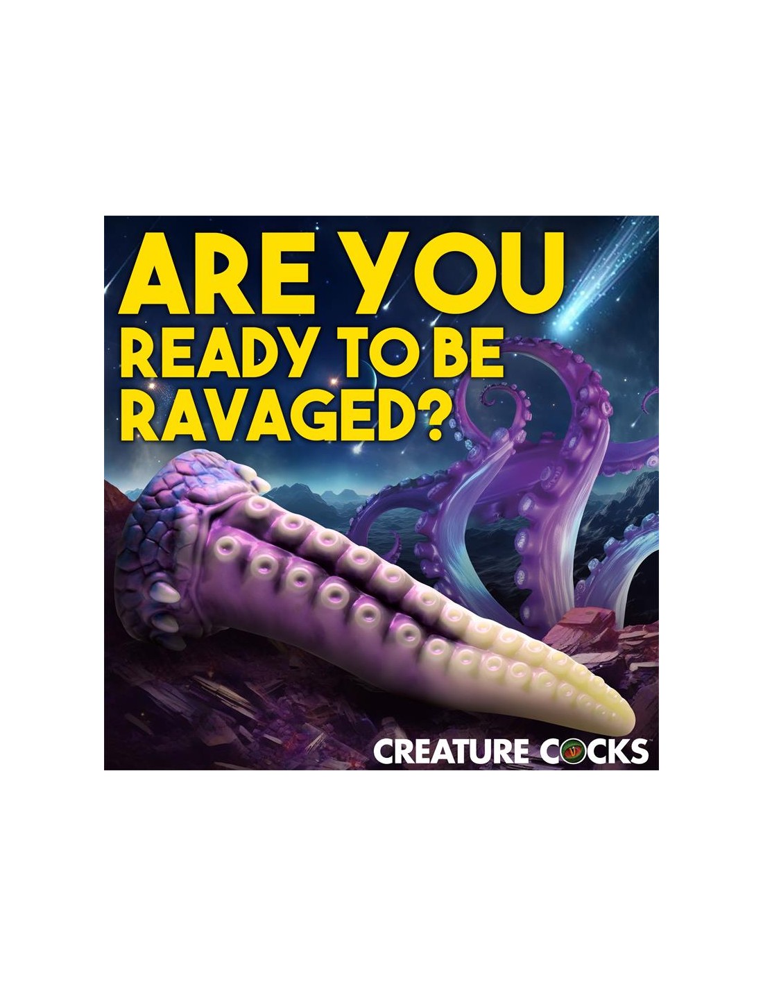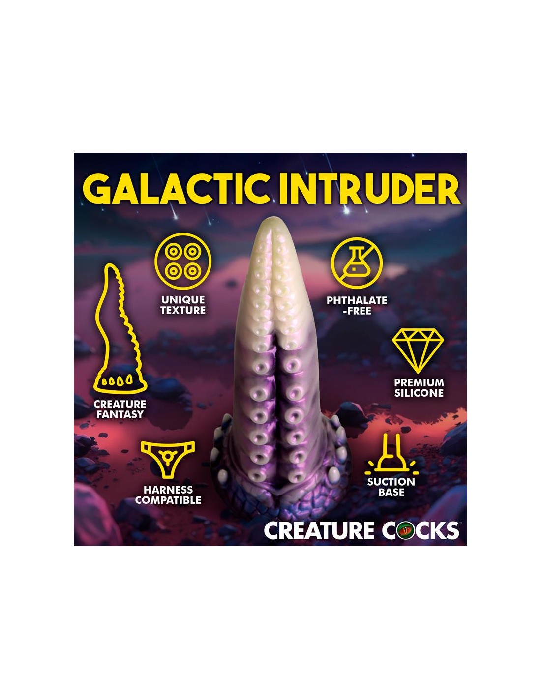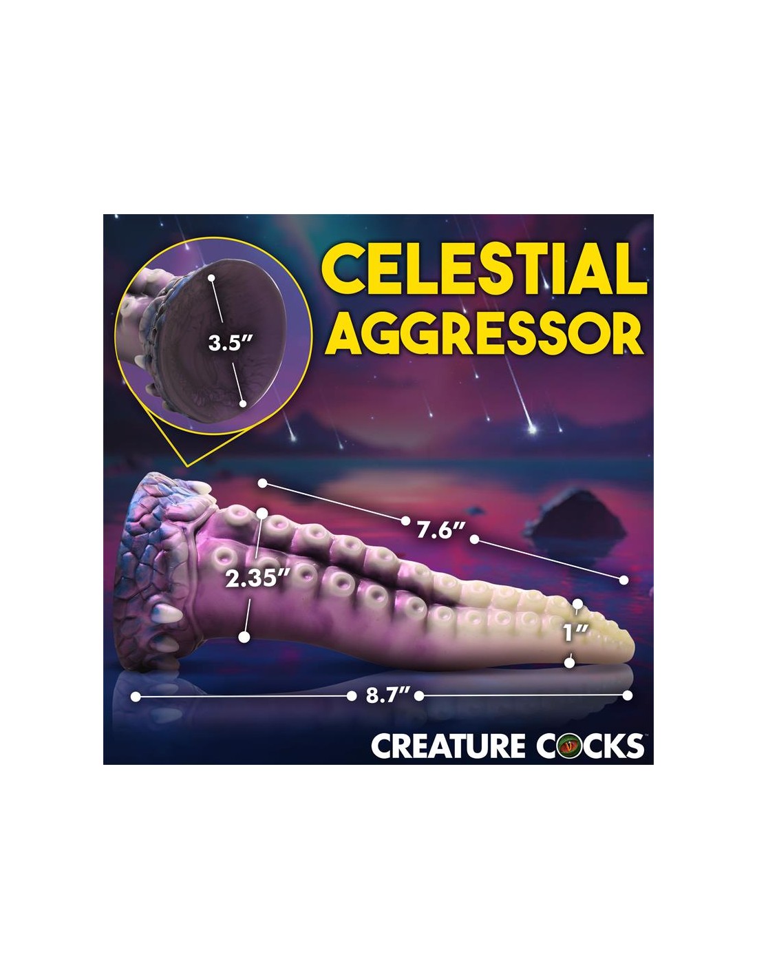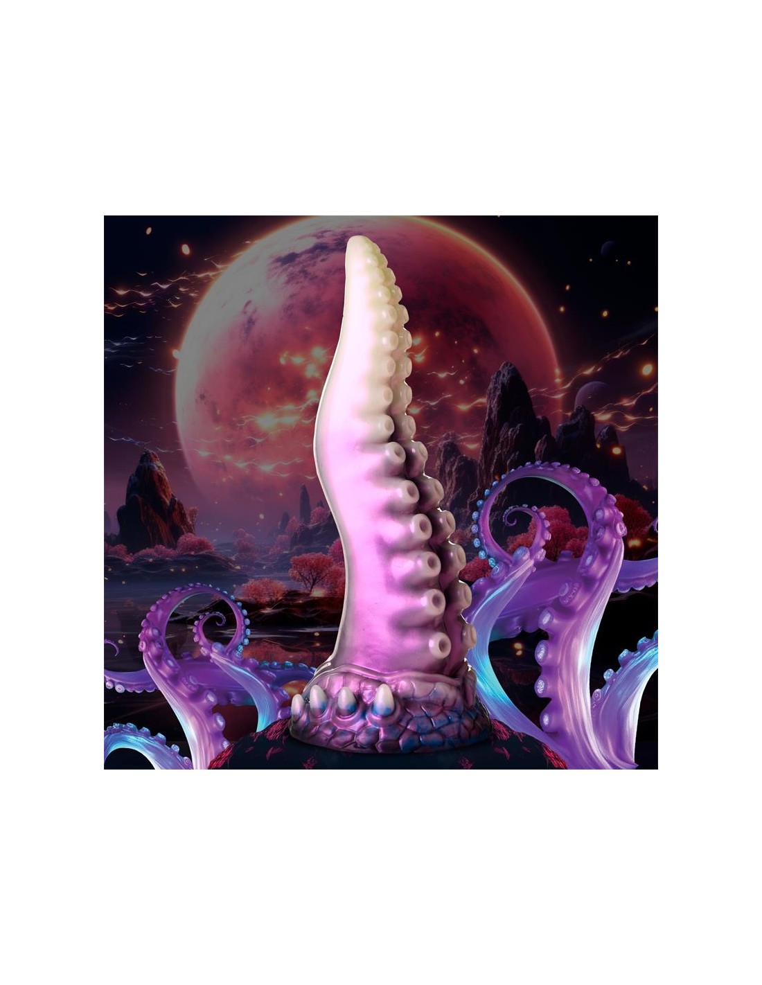 ¡Una aterradora criatura espacial con tentáculos acaba de ser descubierta! Este tentáculo blanco perlado, morado y azul es el pene perfecto. La punta cónica es fácil de insertar, el cuerpo ancho te abre y las ventosas añaden una textura estimulante. Hecho de silicona premium sin ftalatos, tiene un núcleo firme y una superficie suave y sedosa. ¡Explora todas las escenas de ciencia ficción, fantasía, juegos de rol o cosplay que desees con este épico juguete para adultos! Úsalo solo con lubricantes a base de agua para obtener mejores resultados. Después de jugar, lava el dildo con agua tibia y jabón y usa un limpiador de juguetes para limpiarlo. Sécalo y guárdalo en un lugar fresco y oscuro, alejado de la luz solar directa.