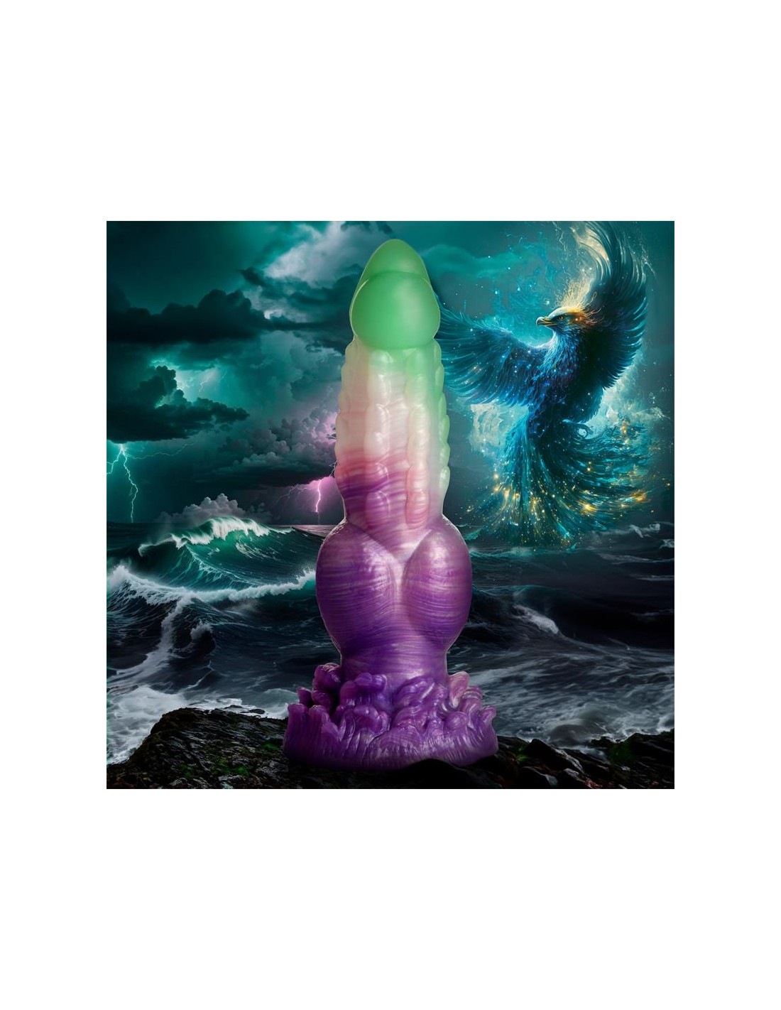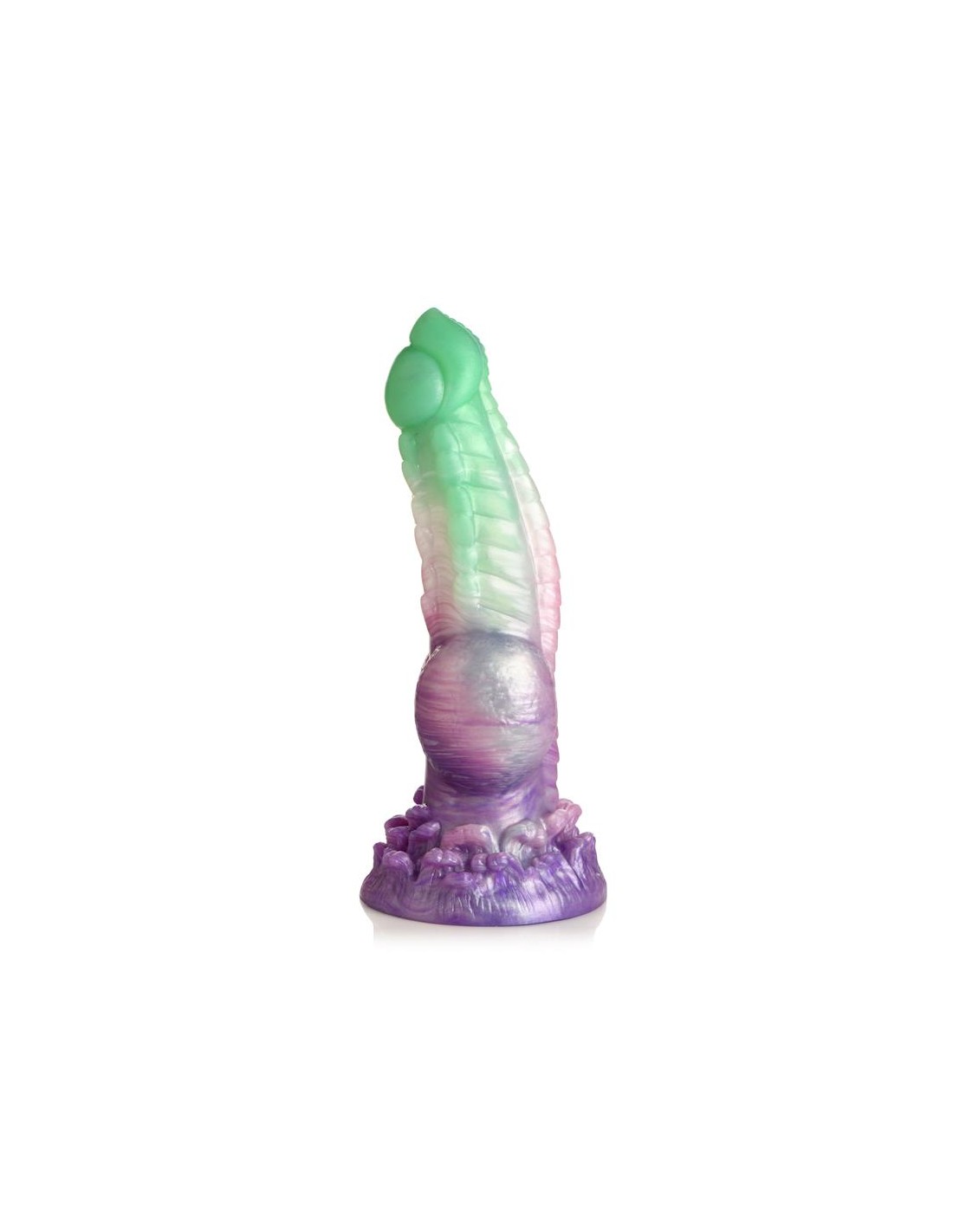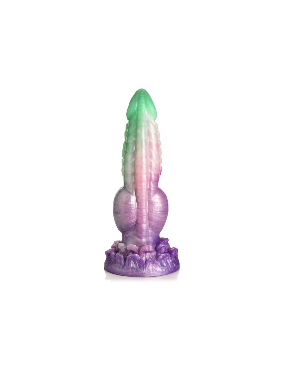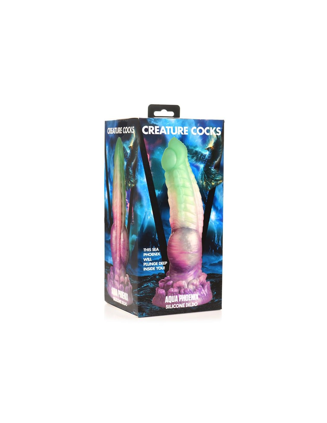 ¡Deja volar tus fantasías míticas! Este singular Aqua Phoenix muere y renace no por fuego, sino con el poder de los mares agitados. El dildo verde jade y morado presenta hileras de firmes crestas a lo largo del eje, una punta lisa, nudos redondos cerca de la base y un plumaje de olas rompientes en la base. Este dildo carnoso tiene una cabeza cónica para facilitar la inserción, pero un cuerpo grueso y grueso que te llevará al límite. Hecho de silicona premium, flexible y libre de ftalatos, este dildo es seguro para el cuerpo y se recomienda usarlo solo con lubricantes a base de agua. ¡Disfruta de experiencias con manos libres gracias a su potente base de ventosa! ¡Invita a tu pareja a disfrutar de un cosplay erótico o un juego de rol de fantasía y usa su arnés favorito para transformar este dildo en un strap-on! Después, asegúrate de lavarlo con agua tibia y jabón suave, rociarlo con un limpiador de juguetes y dejarlo secar al aire. Mantener alejado de la luz solar directa y del calor.