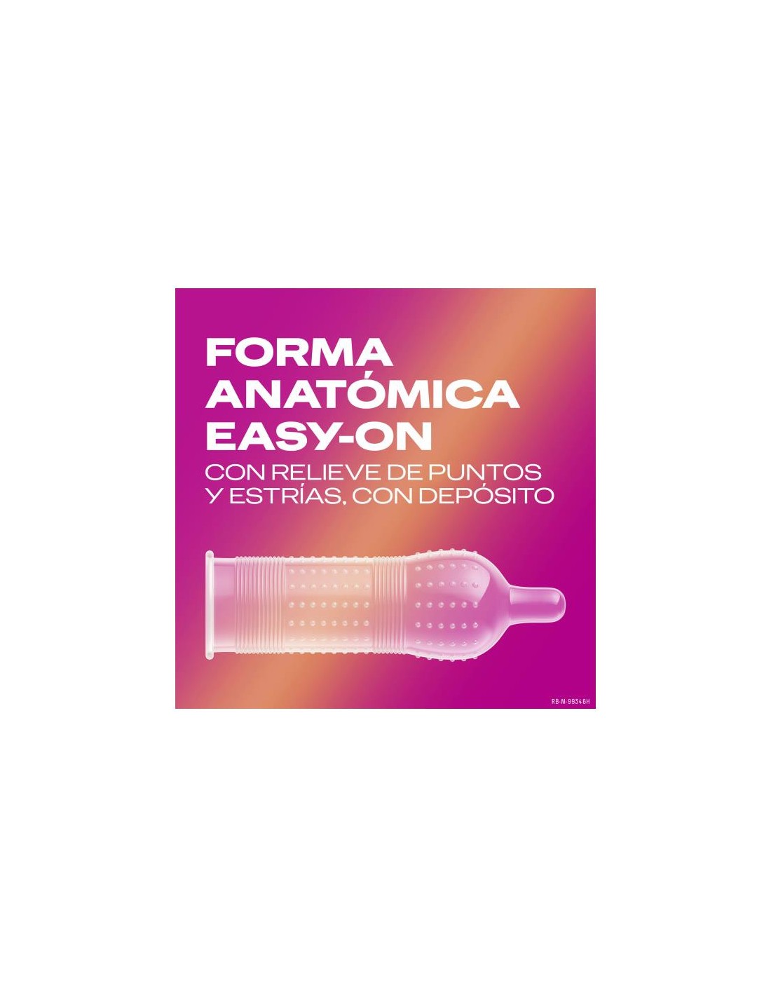 Preservativos con puntos y estrías para maximizar el placer en tus relaciones. Fabricados con látex de caucho natural huelen mejor, son transparentes, lubricados y con depósito. Cuentan con una forma anatómica Easy-On.