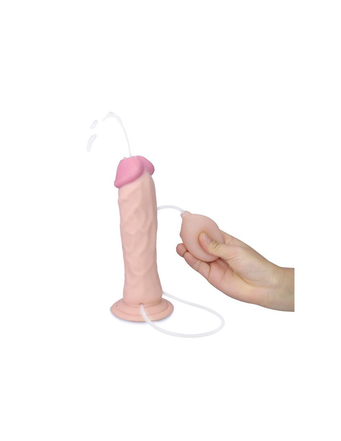 Disfruta de mucha diversión con este dildo suave y realista. Cuenta con una función de eyaculación, por lo que aspira cualquier líquido y lo expulsa, haiendo parecer un pene real.