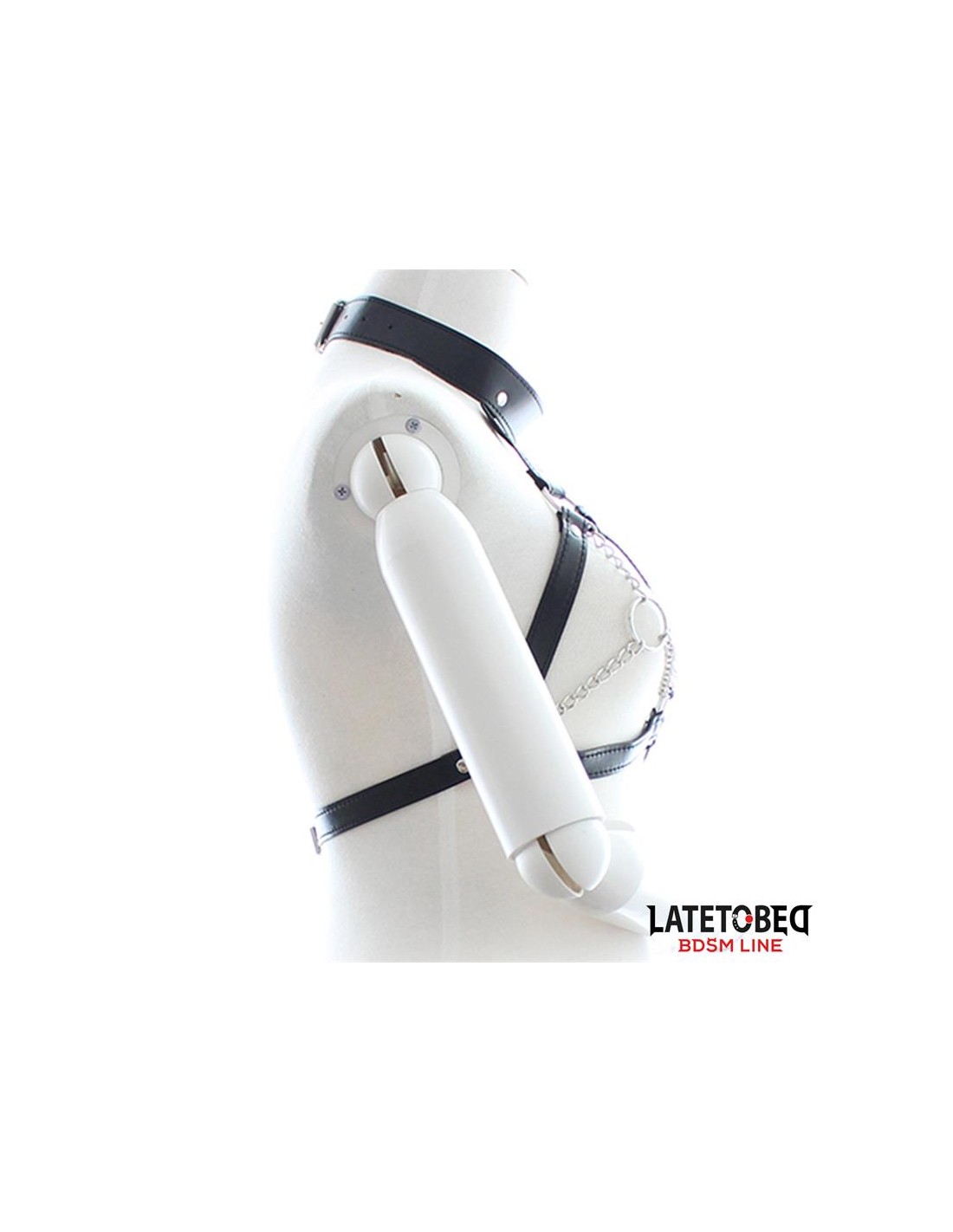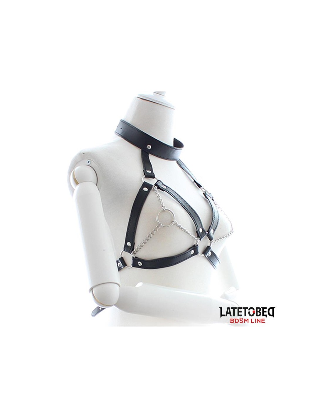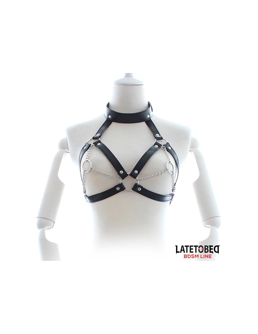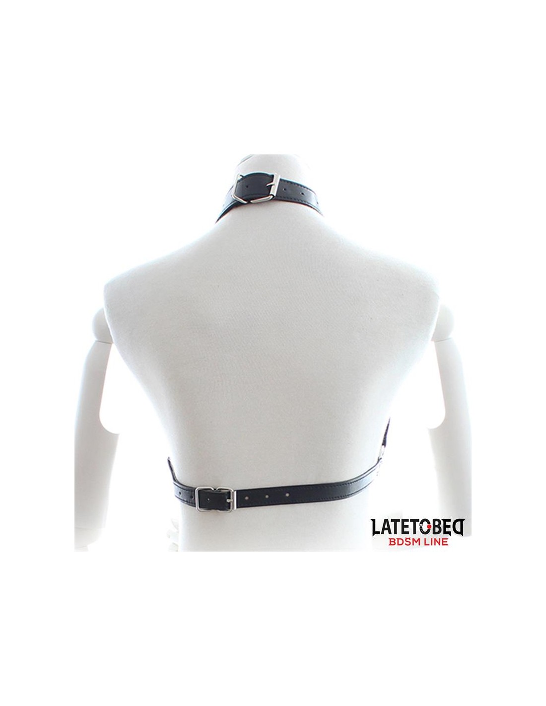 Este artículo es la delicia de cualquier amante del BDSM. Es un arnés de pecho con copas abiertas, de las cuales salen unas cadenas directas a los pezones, los cuales rodea con un aro para darle un look extra erótico.